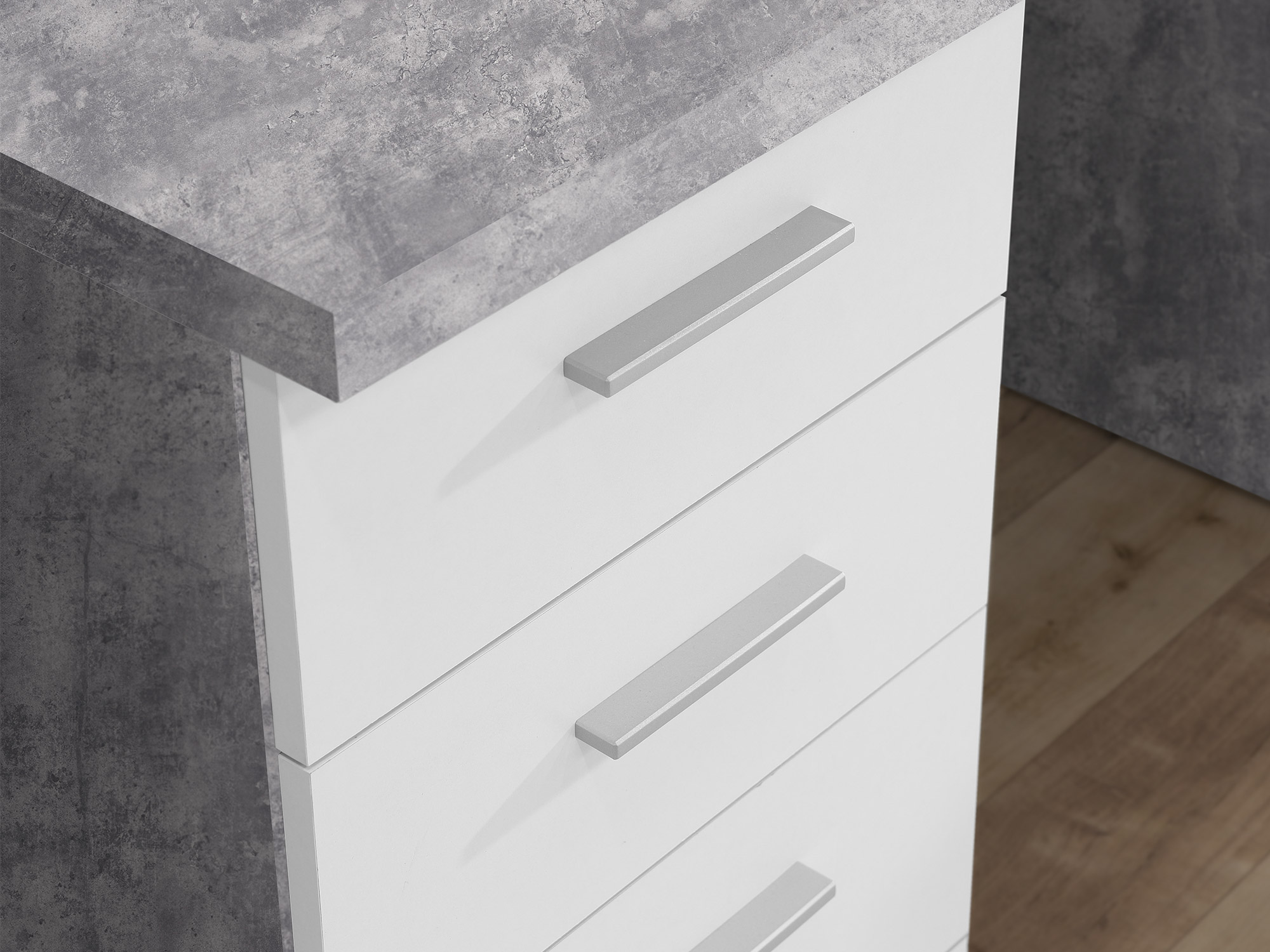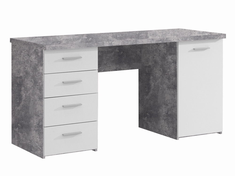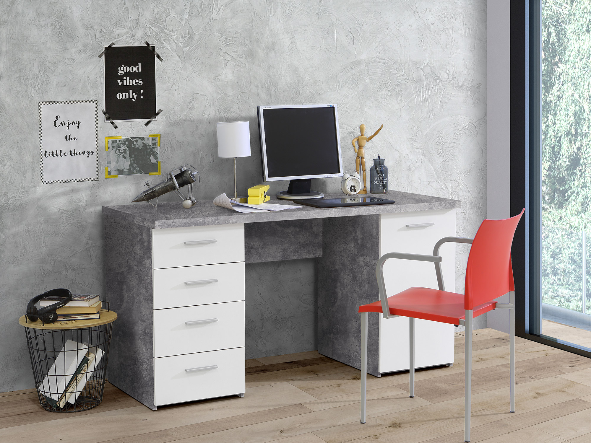 Disponible en plusieurs coloris sur notre site internet, ce bureau Abro 2 est doté d’une porte avec tablette intérieure et de 4 tiroirs sur glissières en métal. Sa structure en panneaux de particules est revêtue de décor blanc mat et imitation béton pour un rendu plus tendance. Tous les compartiments sont équipés de poignées en plastique. Le bureau 145cm Abro 2 est à assembler soi-même.