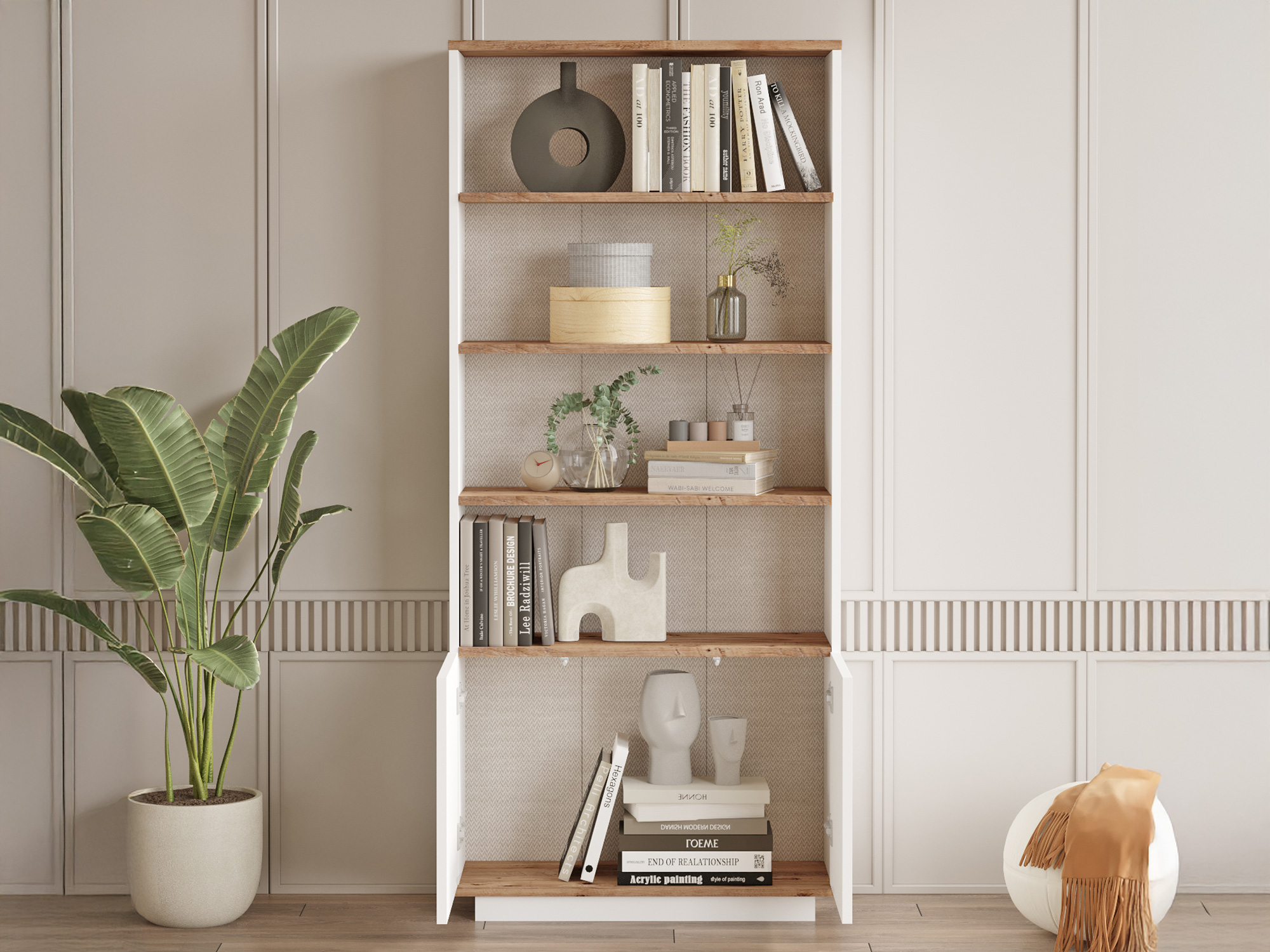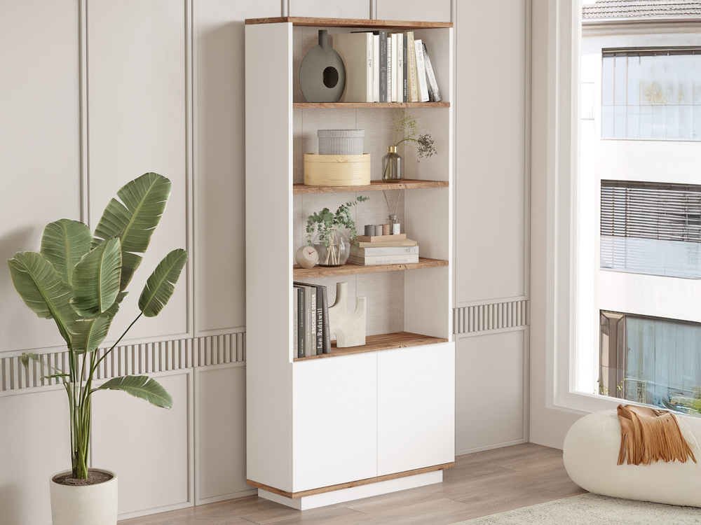 Conçue en panneaux mélaminés de 18 mm, la bibliothèque Alessia se distingue par son coloris blanc mat associé à des finitions en pin, créant un contraste harmonieux et moderne. Dotée de deux portes à ouverture push et de trois étagères, cette bibliothèque blanc et bois offre un bel espace de rangement pour vos livres, objets déco, ou accessoires. Le système d’ouverture sans poignées assure un design épuré et minimaliste, tout en facilitant l'accès à vos affaires. Le meuble est à assembler soi-même.
