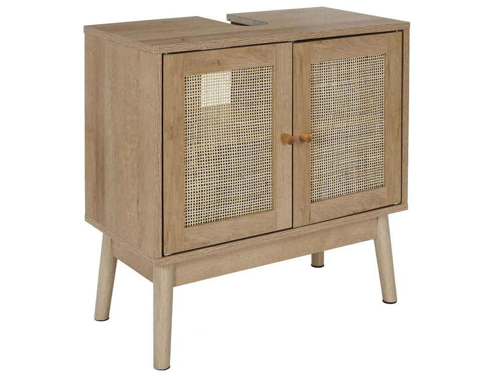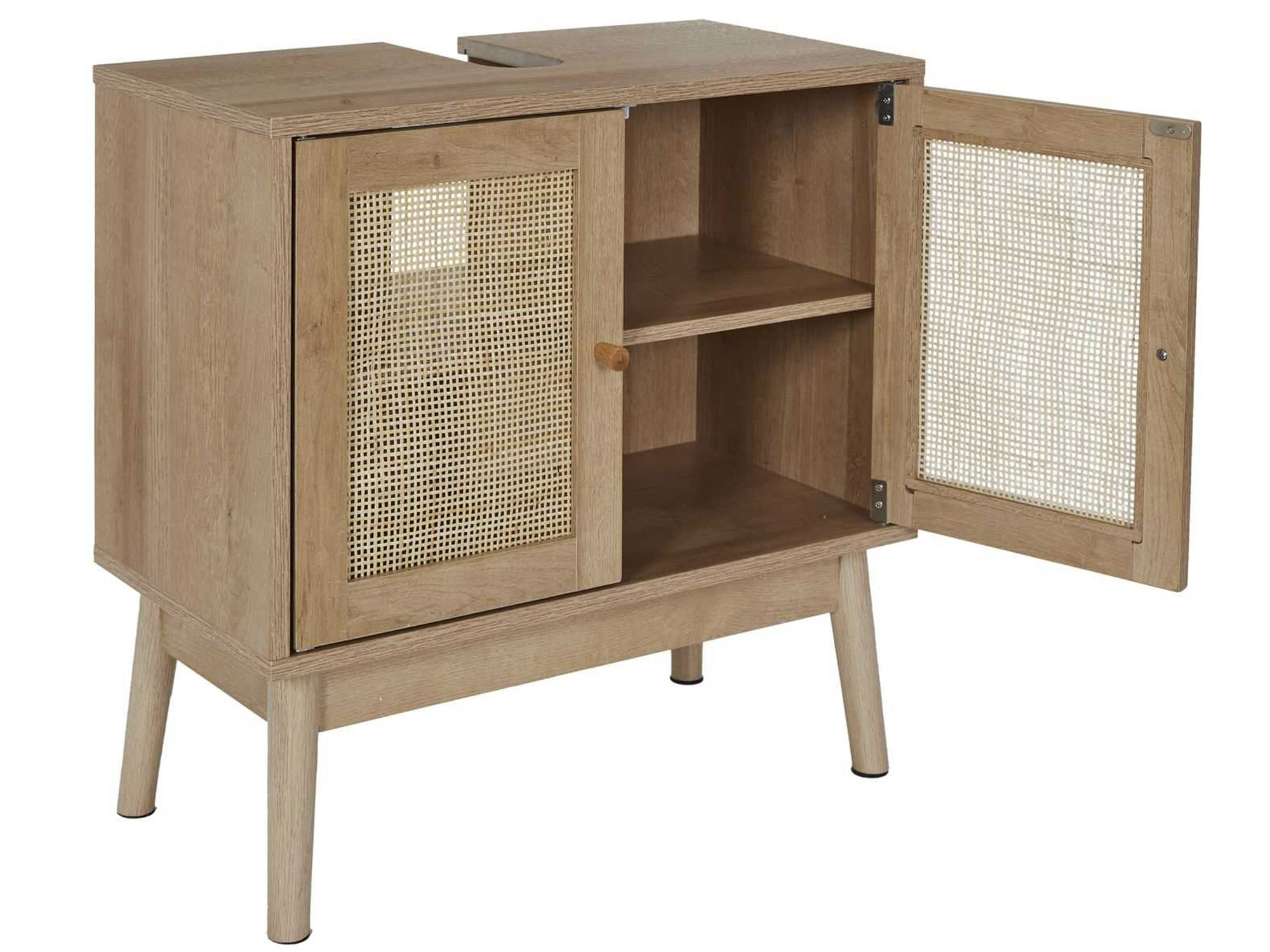 Notre meuble sous-vasque allie fonctionnalité et design avec son style épuré et ses portes en rotin tressé, apportant une ambiance chaleureuse et naturelle à votre salle de bain. Conçu pour s'adapter harmonieusement sous votre vasque, il maximise l'espace de rangement sans encombrer votre pièce. Les détails raffinés, comme les poignées en bois et les pieds élancés, soulignent son esthétique minimaliste tout en offrant une stabilité robuste. L'intérieur spacieux est parfait pour organiser vos serviettes, produits de beauté et autres nécessités de salle de bain, gardant ainsi votre espace net et sans désordre. Avec ce meuble, transformez votre salle de bain en un sanctuaire de détente et d'ordre.