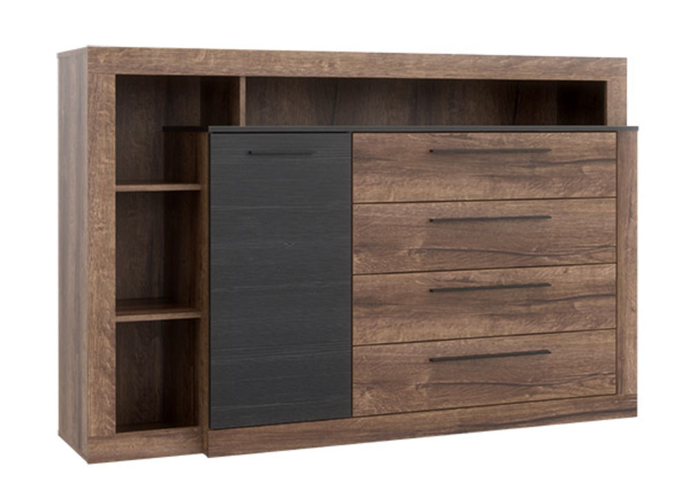 La commode Bellevue saura sûrement vous satisfaire et répondre à tous vos besoins de rangement grâce à son agencement original et efficace. Ce meuble s’intégrera facilement dans votre chambre à coucher contemporaine ou vintage et apportera une note de raffinement supplémentaire grâce à son coloris chêne/chêne noir.