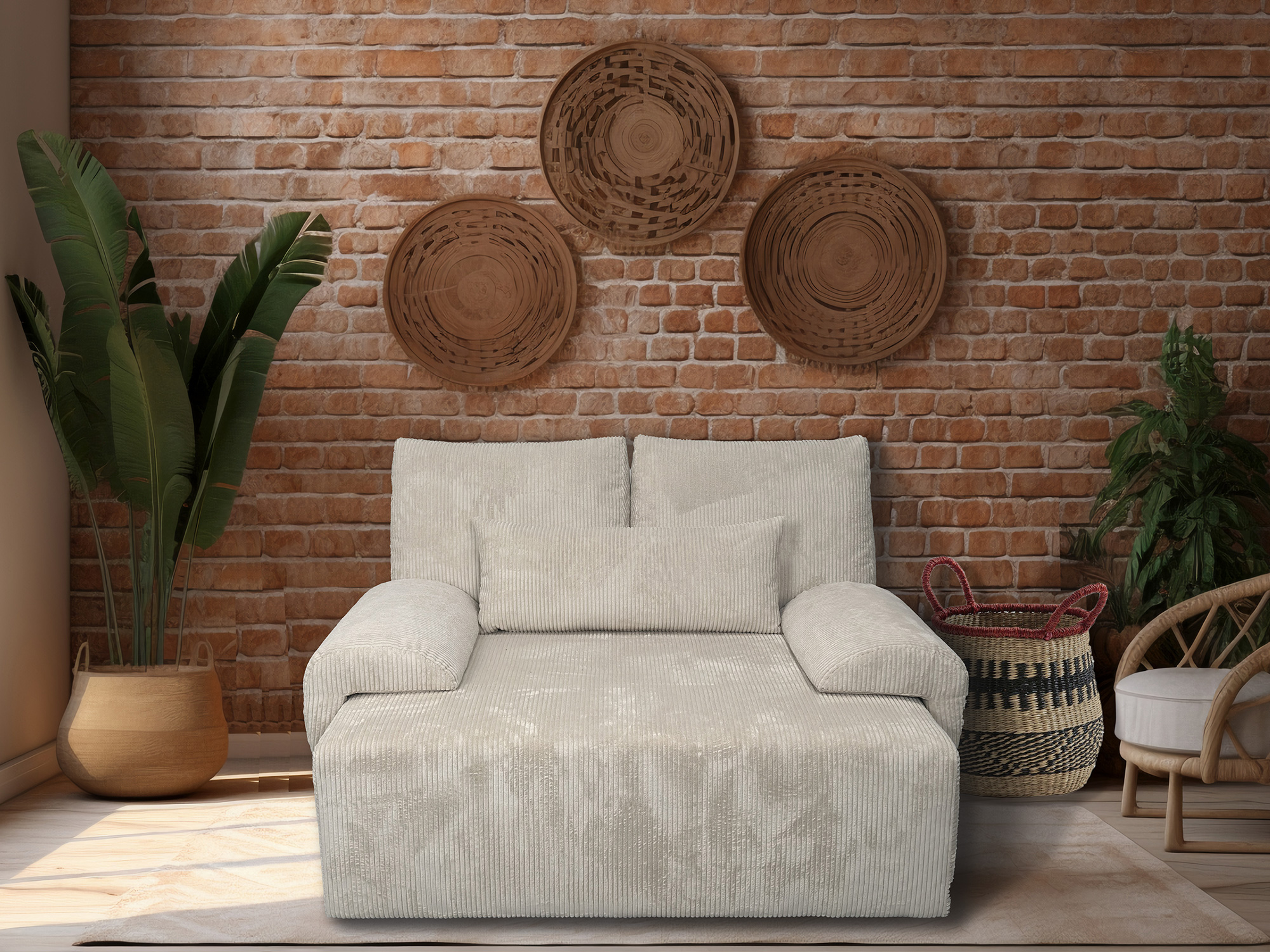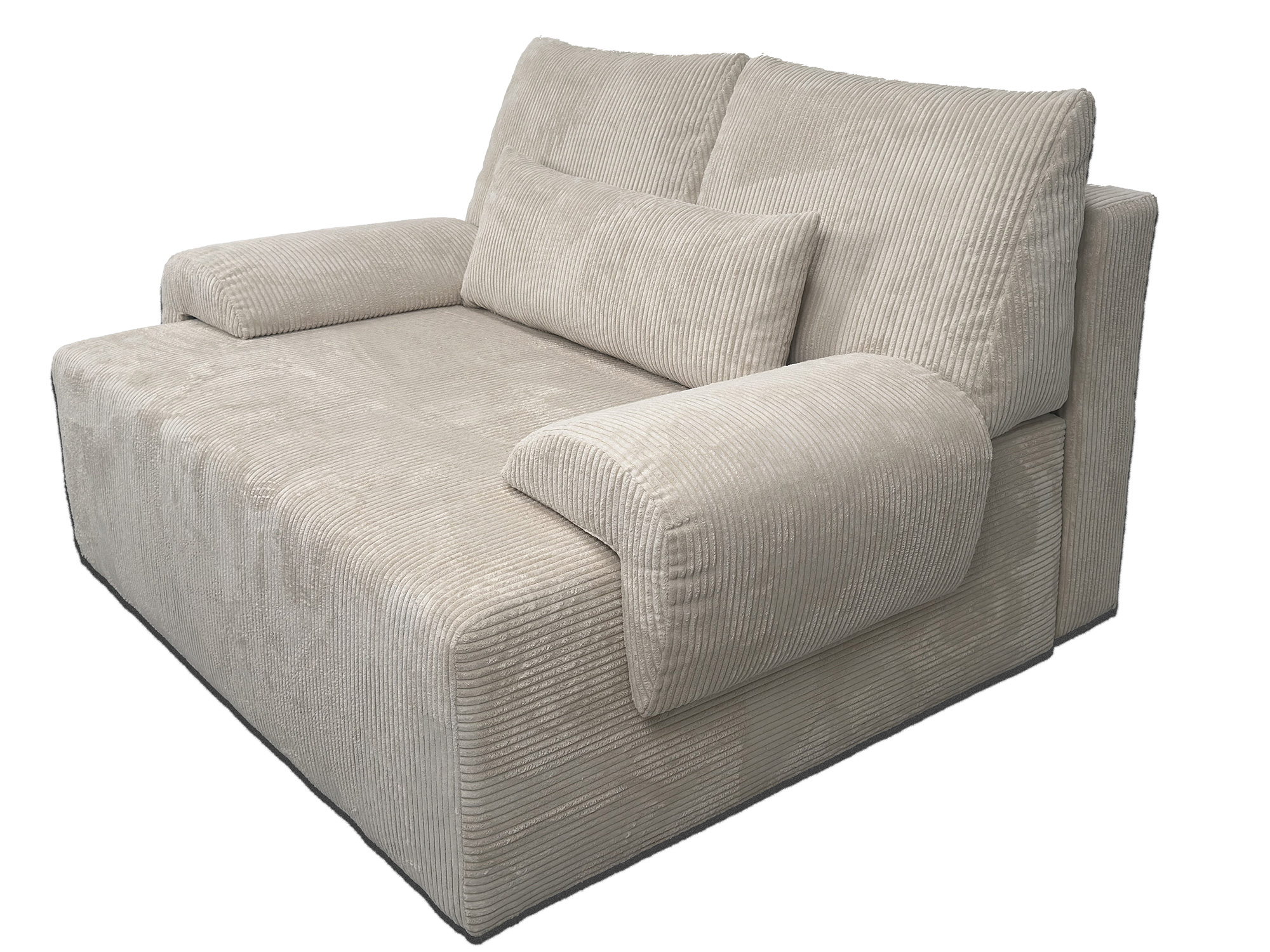 Assise en mousse polyuréthane 28 kg/m3 + ouate polyester 200 g/m2.Dossiers en flocons de mousse + fibre polyester + ouate polyester 200g/m2. Coussins de dossier déhoussables.