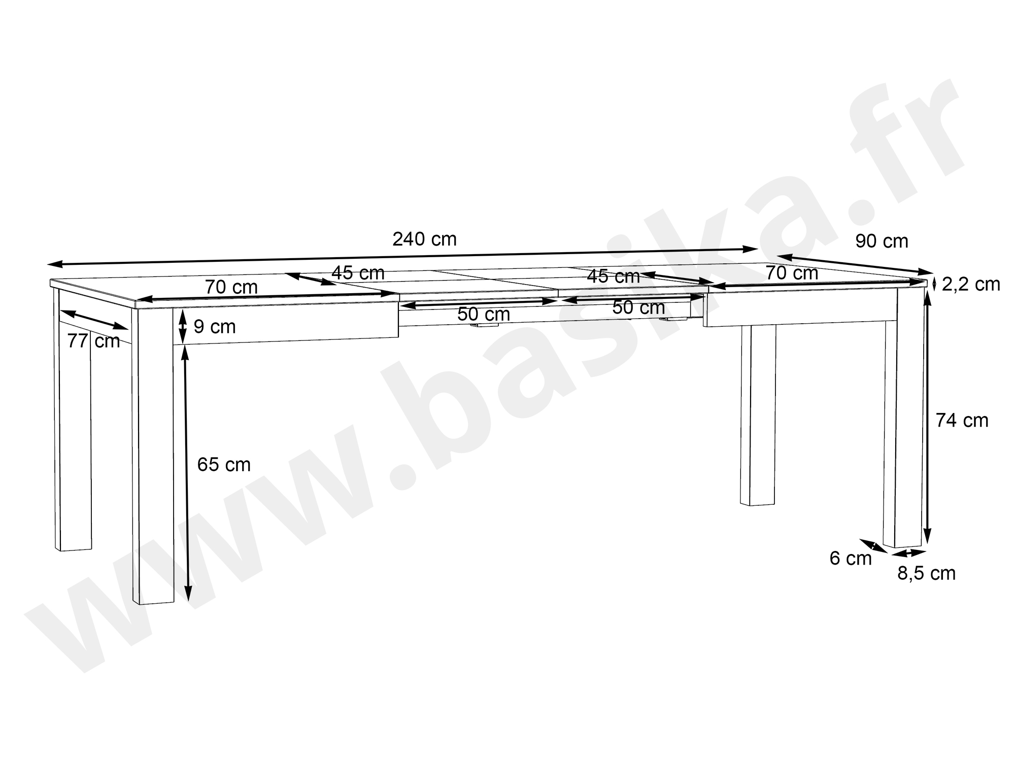 Table de repas rectangulaire extensible de 140 à 240 cm.