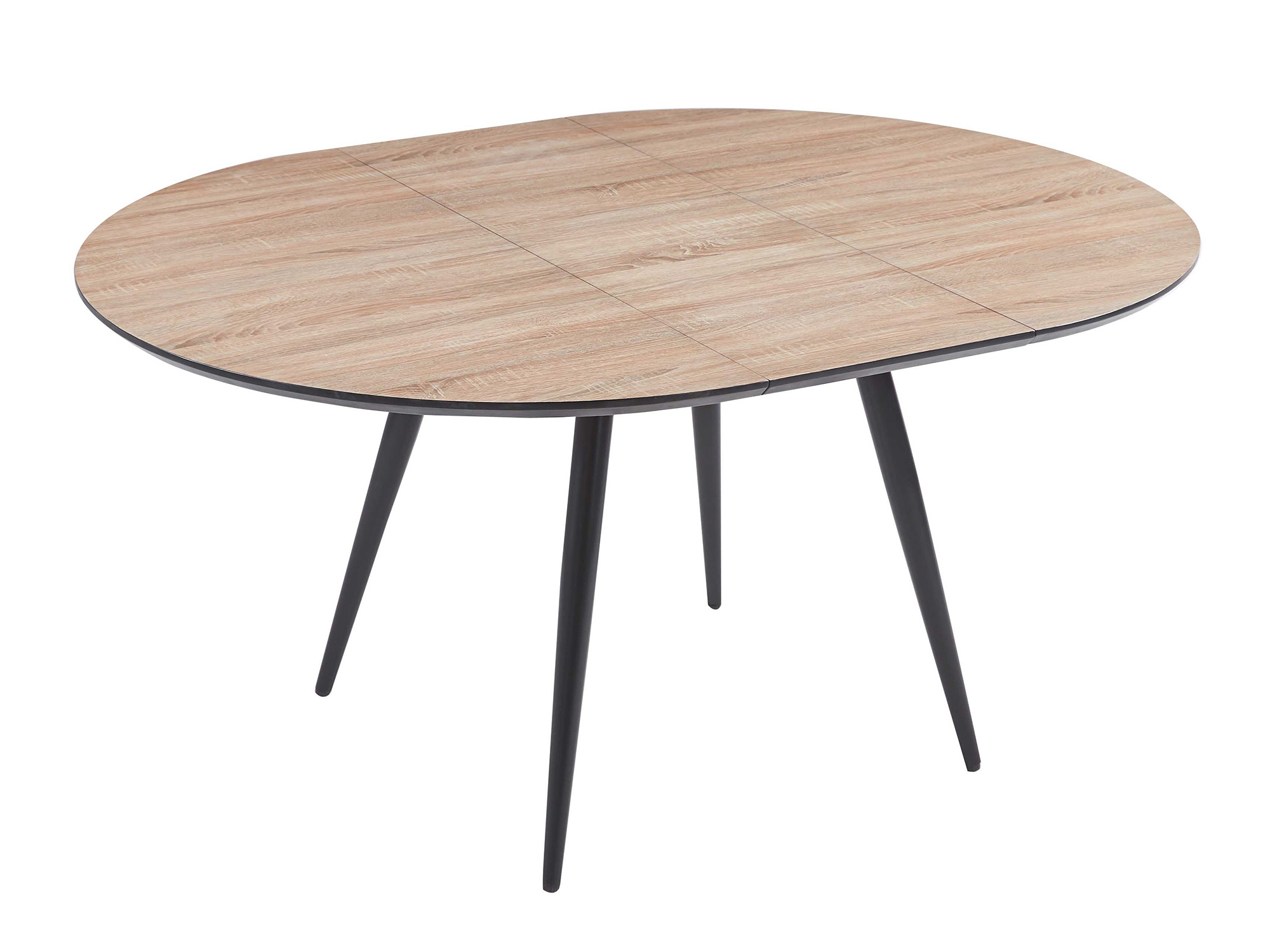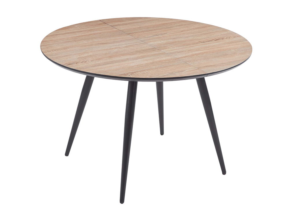 Table de repas ronde extensible de 120 à 160 cm. Allonge portefeuille qui se range sous le plateau.