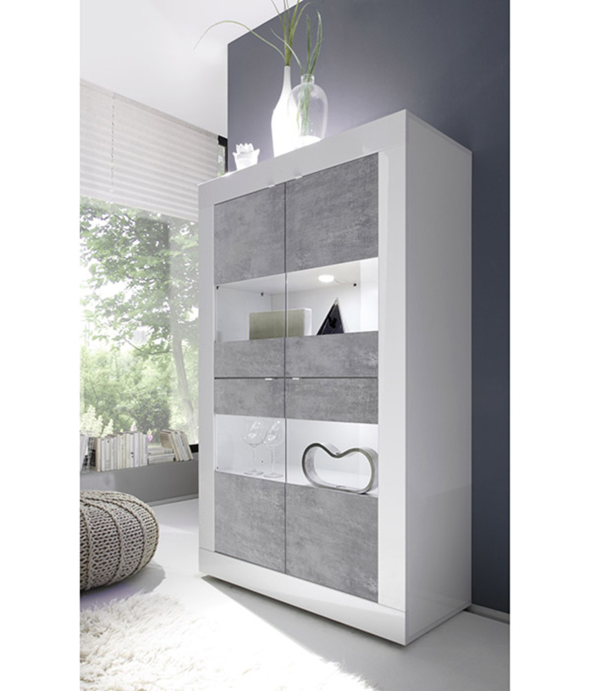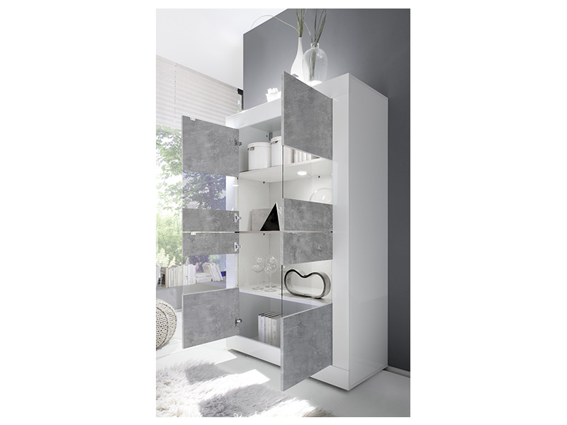 Vitrine 4 portes vitréés Costa blanc brillant/béton