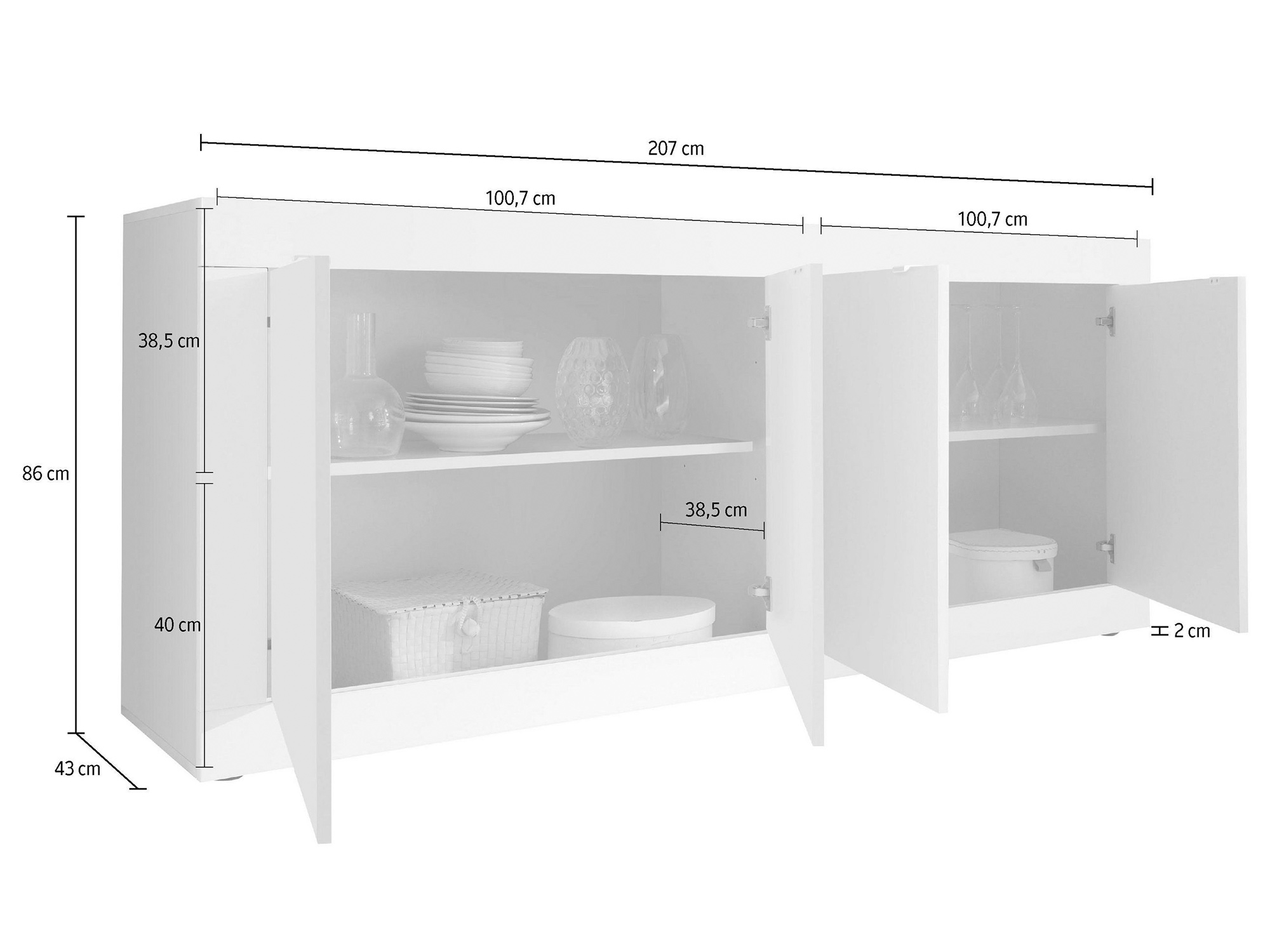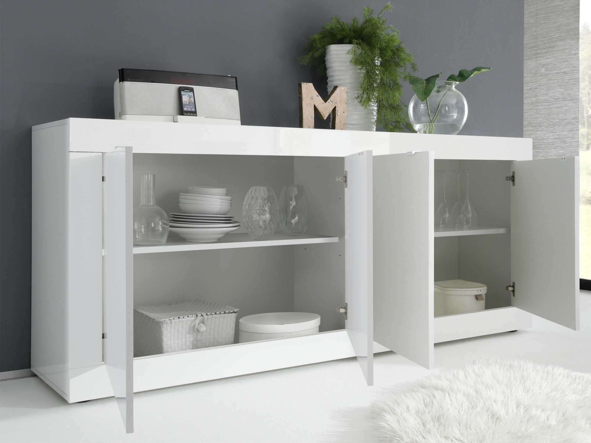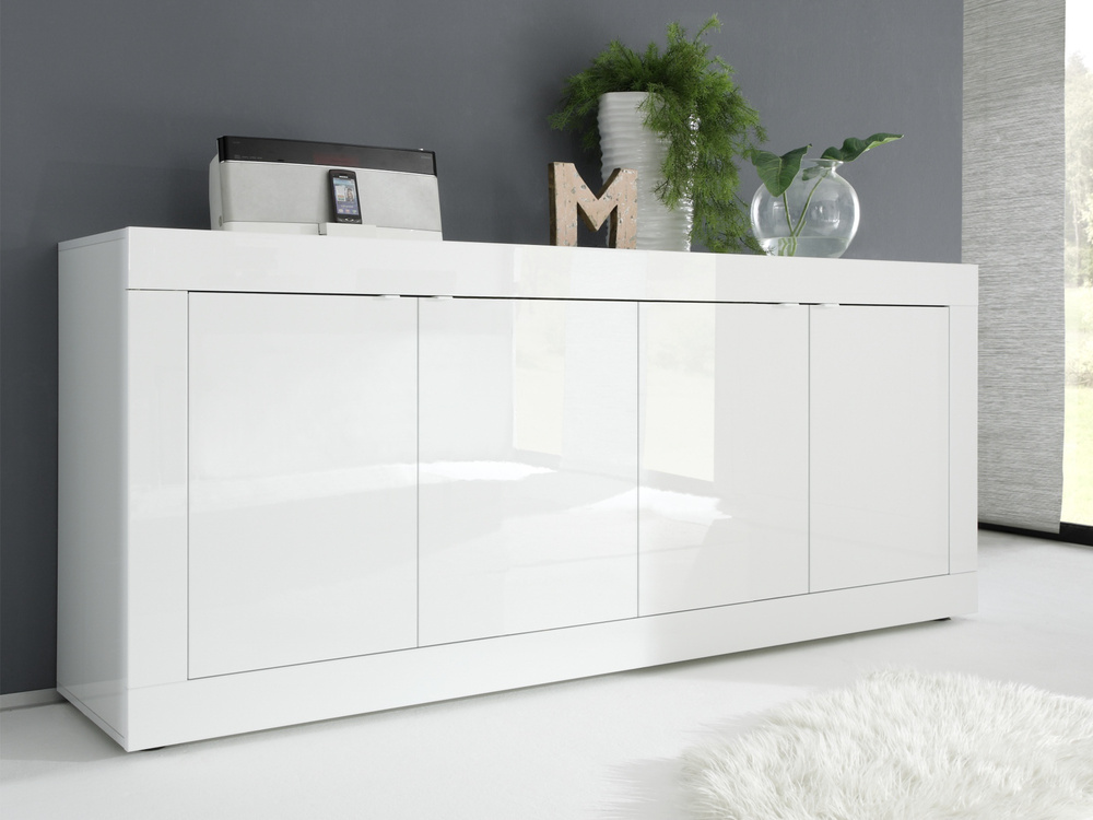 Salle à manger complète en blanc brillant. Structure des meubles en panneaux de particules de 16 et 18mm. Eclairage LED en option pour tablettes en verre des meubles TV, colonnes et vitrines. Meubles faciles à monter à l'aide de la notice de montage jointe. Provenance Italie.