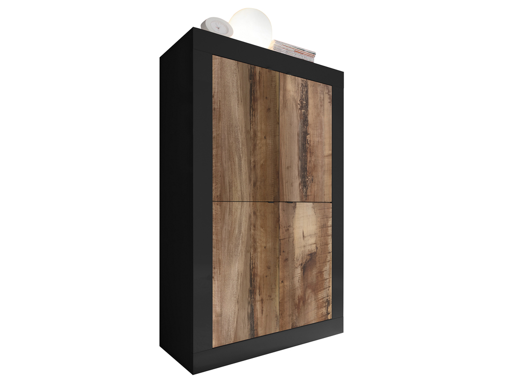 Vitrine 4 portes pleines. Aménagement intérieur: 3 étageres en panneaux de fibre de moyenne densité. Poignées en métal.