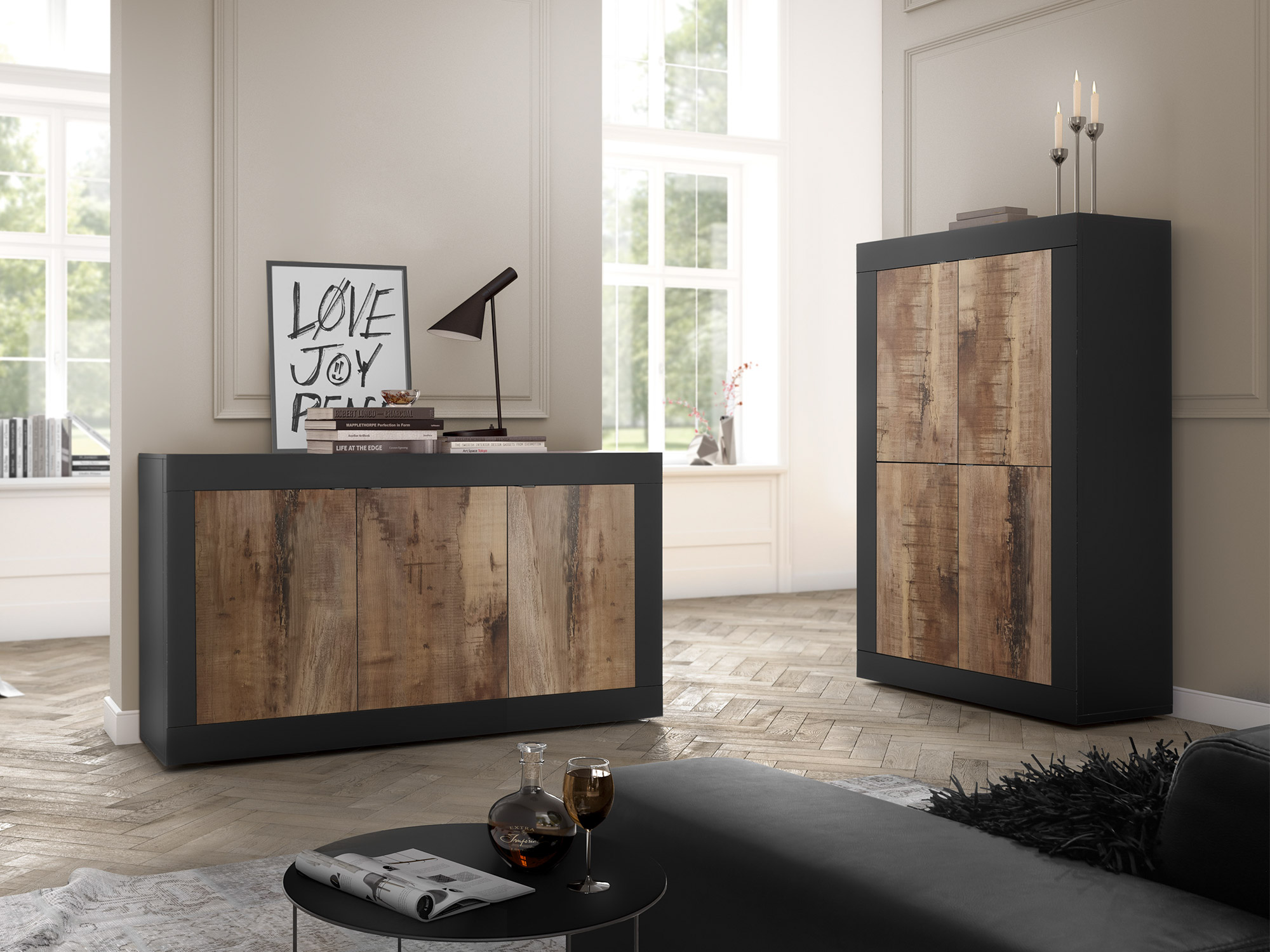 Salle à manger complète en 2 coloris noir mélaminé et façade coloris poirier.Structure des meubles en panneaux de particules de 16 et 18mm. Eclairage LED en option pour tablettes en verre des meubles TV, colonnes et vitrines. Meubles faciles à monter à l'aide de la notice de montage jointe. Provenance Italie.