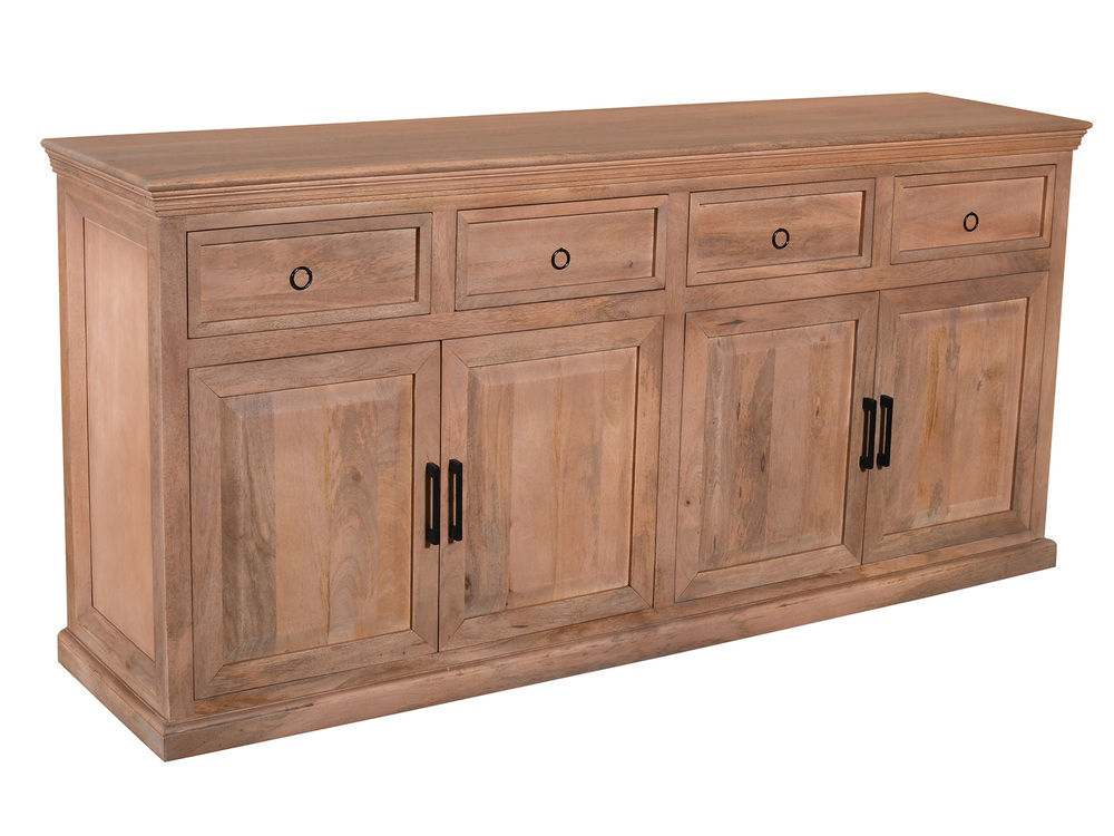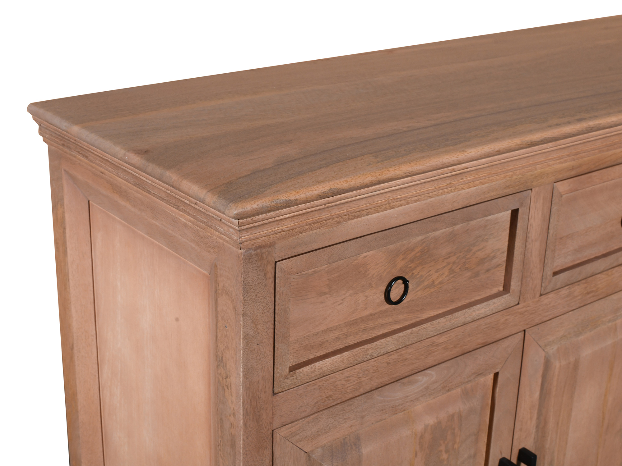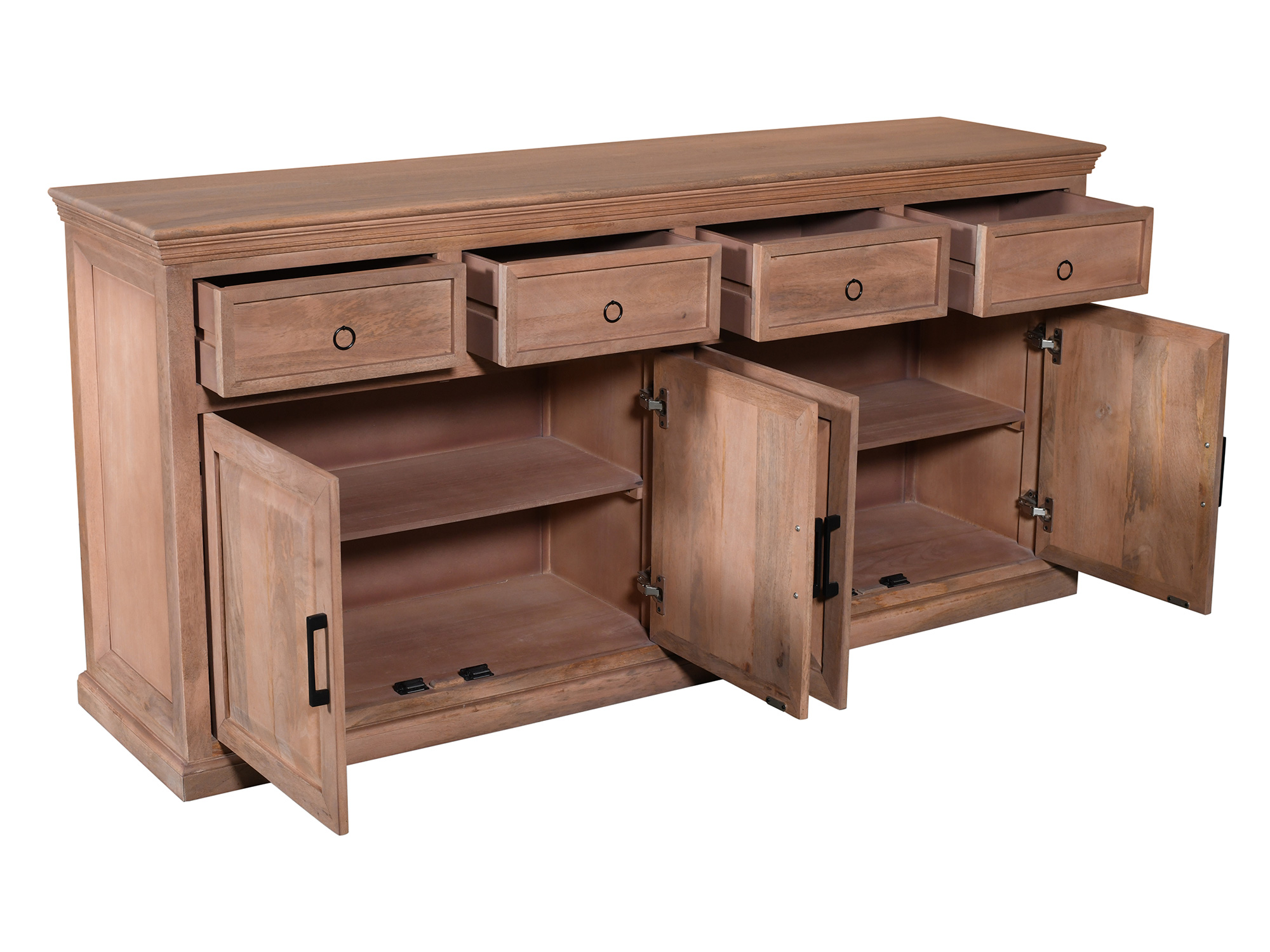 Avec ses 4 tiroirs pratiques et ses 4 portes généreuses, vous bénéficiez d’un vaste volume de rangement pour garder vos affaires bien organisées : vaisselle, livres ou textiles trouvent facilement leur place. La structure en acacia massif, renforcée par un replacage acacia massif sur MDF pour les intérieurs, garantit une solidité remarquable tout en mettant en valeur les nuances uniques du bois.