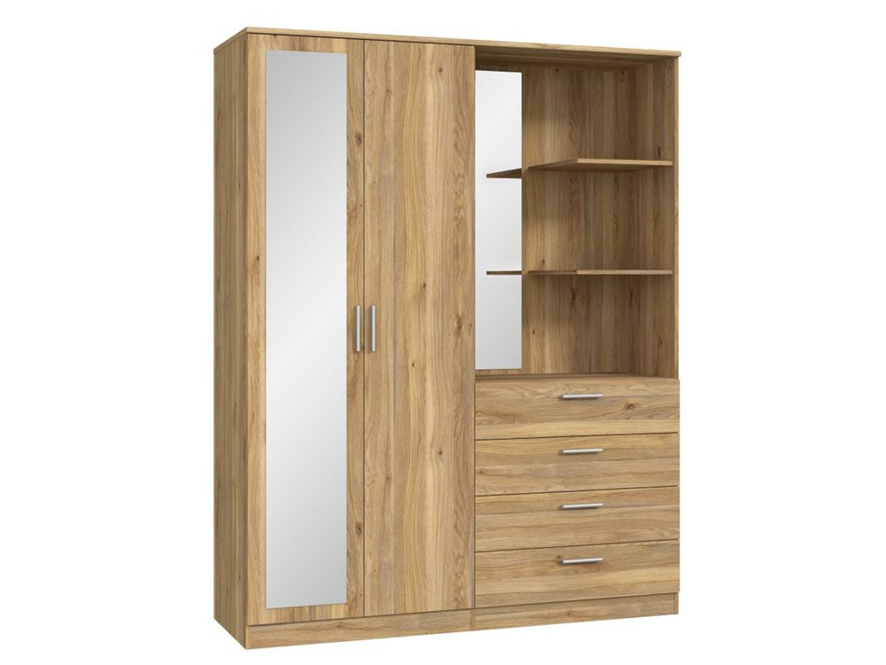 Armoire 2 portes dont 1 miroir,4 tiroirs et 2 étagères niches avec miroir.