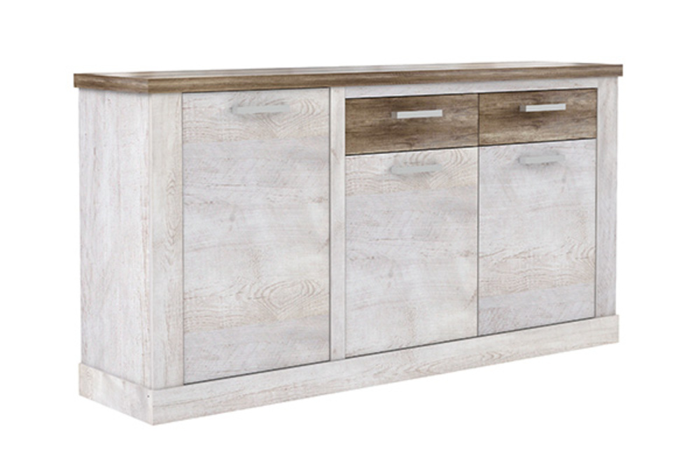 Avec sa structure fabriquée en panneaux de particules revêtue de papier décor bicolore pin blanc et chêne antique, le bahut Duro assure un haut niveau de résistance. Composé de 3 portes et 2 tiroirs, il sera bien utile pour ranger votre vaisselle.
