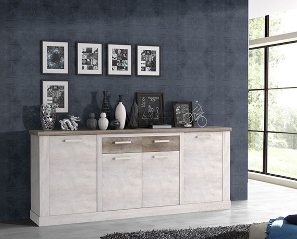 Avec une structure en panneaux de particules revêtue de décor bicolore pin blanc/chêne antique, le bahut Duro vous garantit une très bonne résistance dans le temps. En plus, son aménagement composé de 4 portes et 2 tiroirs vous sera très utile pour ranger toute votre vaisselle.