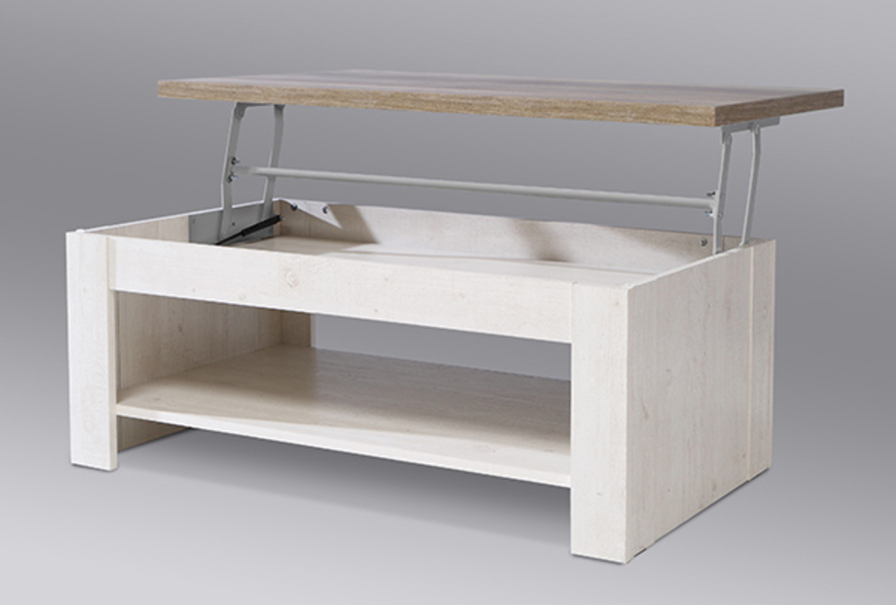 Très pratique, la table basse relevable Duro pin blanc et chêne antique séduit par ses couleurs naturelles et accueillantes. Ce meuble est à assembler soi-même.