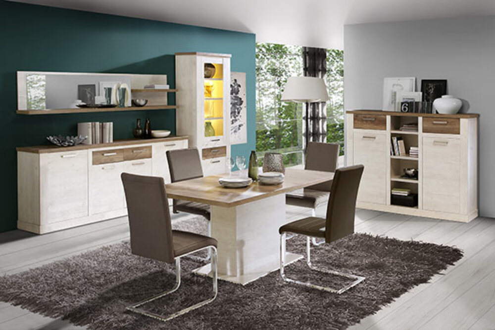 De fabrication européenne, la table de repas Duro pin blanc et chêne antique est garantie 2 ans chez Basika.