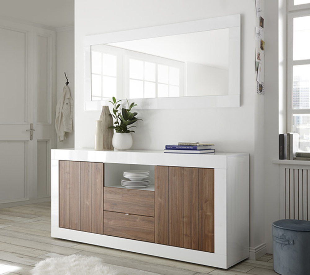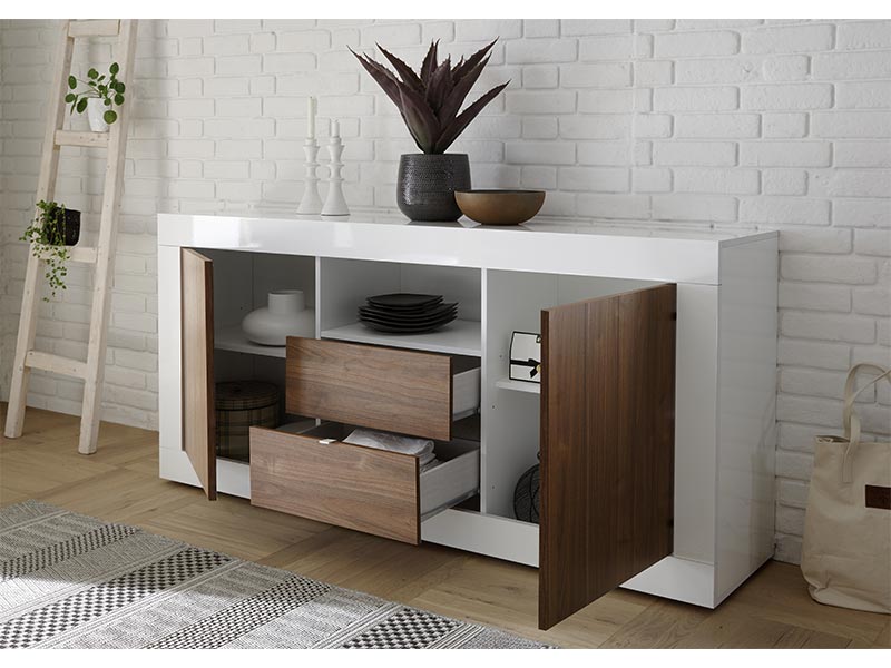 Bahut 2 portes 2 tiroirs Ferrara blanc brillant/noyer
