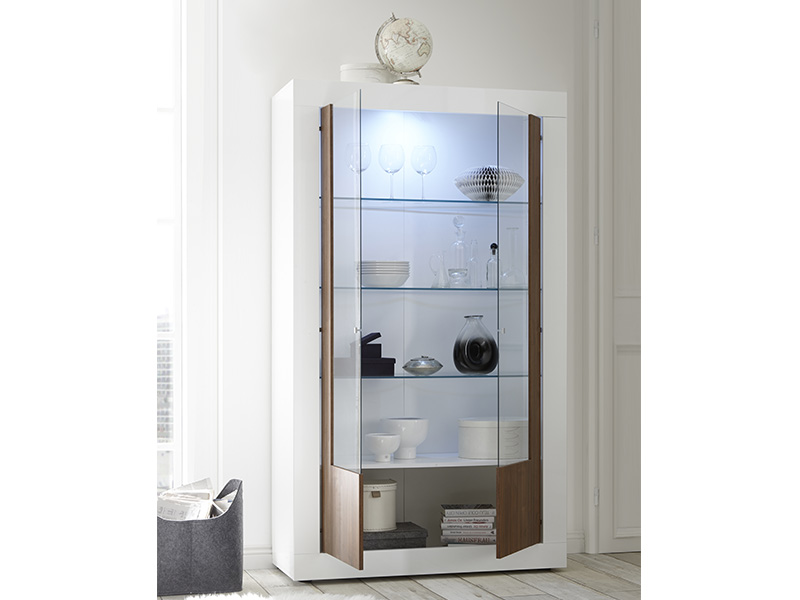Vitrine 2 portes vitrées Ferrara blanc brillant/noyer