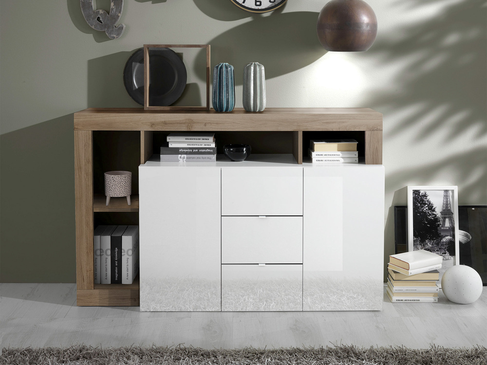 Le bahut Fribourg associe élégance et praticité pour un intérieur moderne et raffiné. Avec son alliance parfaite de façades blanc brillant et de sa structure en décor chêne cadiz, il incarne un style contemporain avec une touche naturelle et chaleureuse.