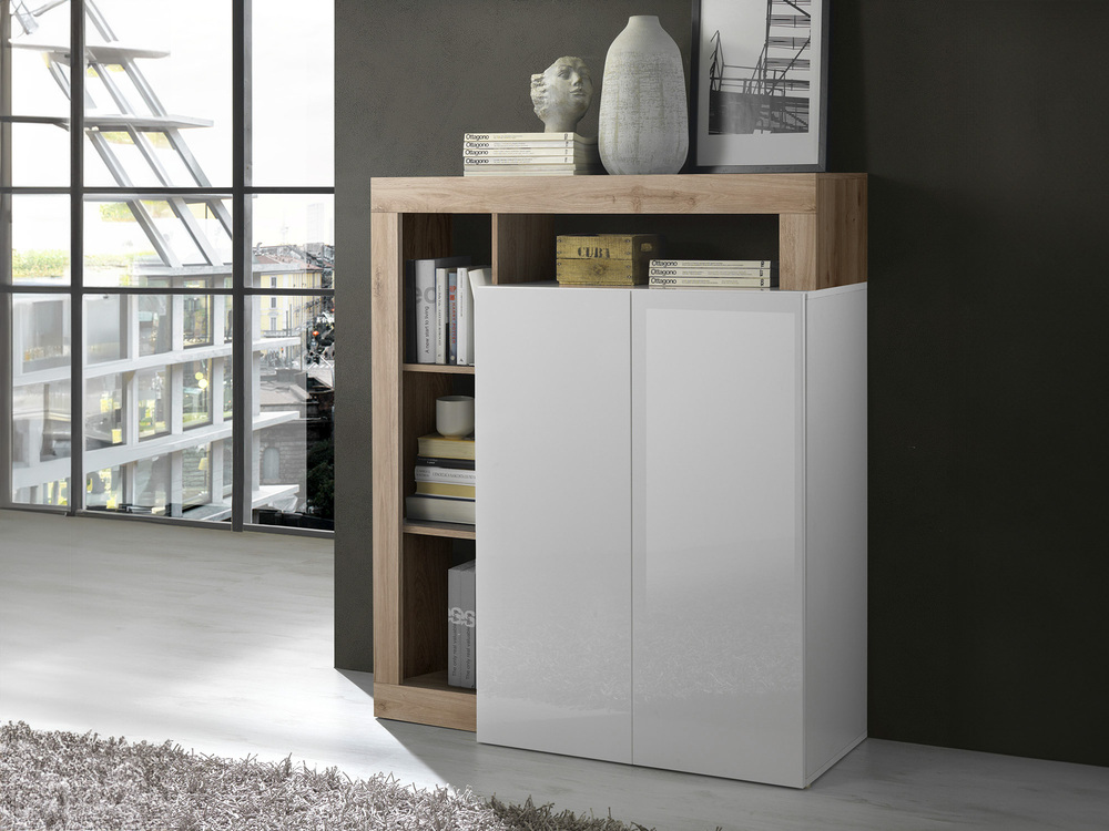 Structure en paneeaux revetus de décor chene cadiz. Façade en coloris blanc brillant. Charnières en métal. A assembler.