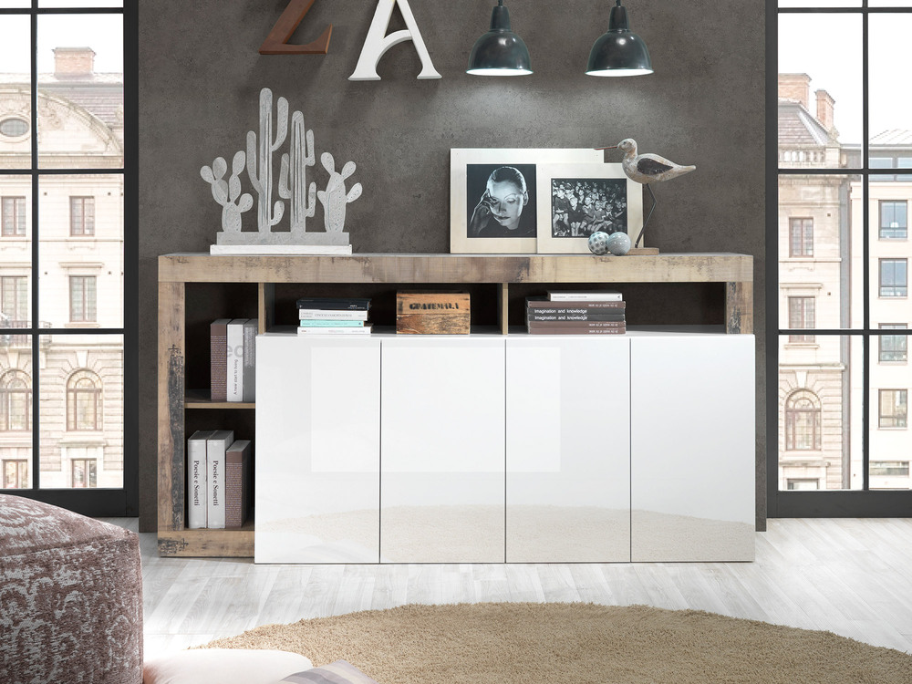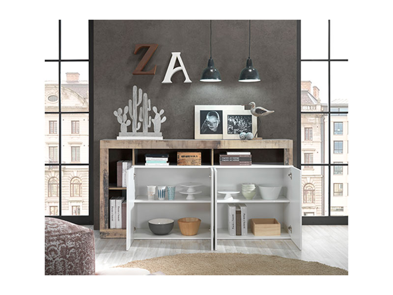 La ligne unique de l'enfilade Fribourg sera sans hésitation un élément clef de votre séjour. Son décor en bois vintage et sa façade en blanc brillant apporteront une touche design et fonctionnelle à votre intérieur.