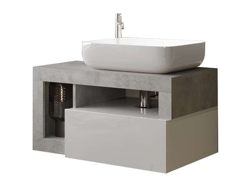 Panneaux de particules 16mm revetus de décor imitation béton et blanc brillant. Robinet et siphon non inclus. Bonde non fournie. Diamètre de l'évacuation : 42 mm. Pas de trop plein sur la vasque. Diamètre du perçage pour robinet : 35 mm.