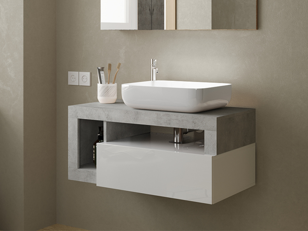 Panneaux de particules 16mm revetus de décor imitation béton et blanc brillant. Robinet et siphon non inclus. Bonde non fournie. Diamètre de l'évacuation : 42 mm. Pas de trop plein sur la vasque. Diamètre du perçage pour robinet : 35 mm.
