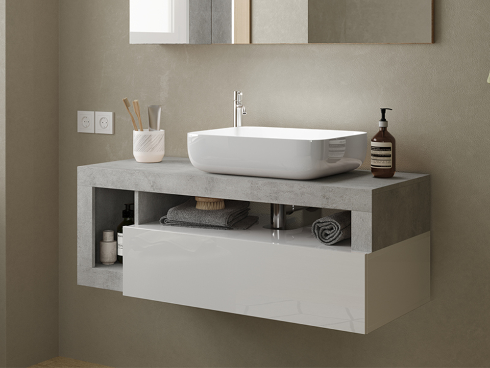 Meuble de salle de bain 1 tiroir 2 niches suspendu Fribourg salle de bain blanc/béton