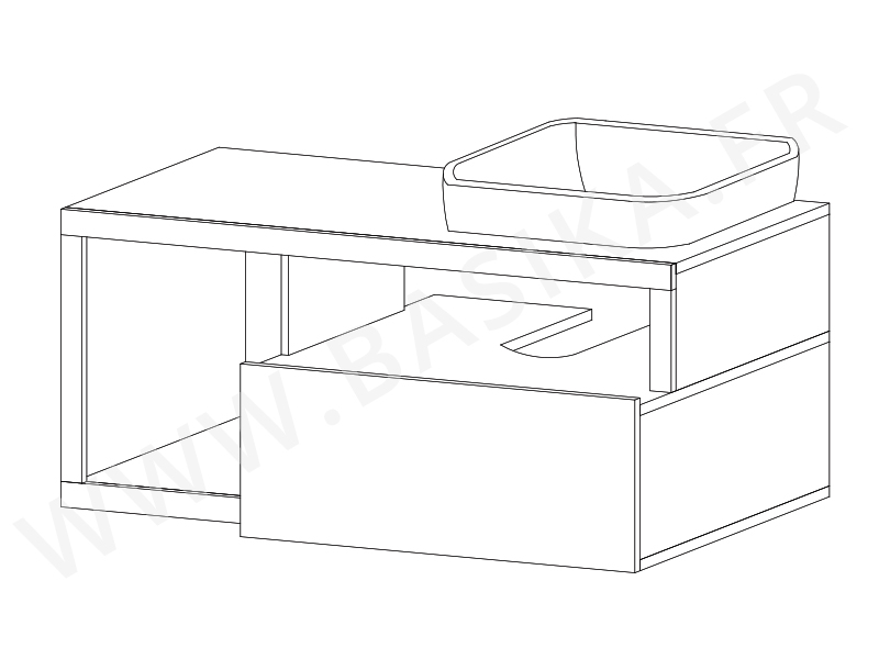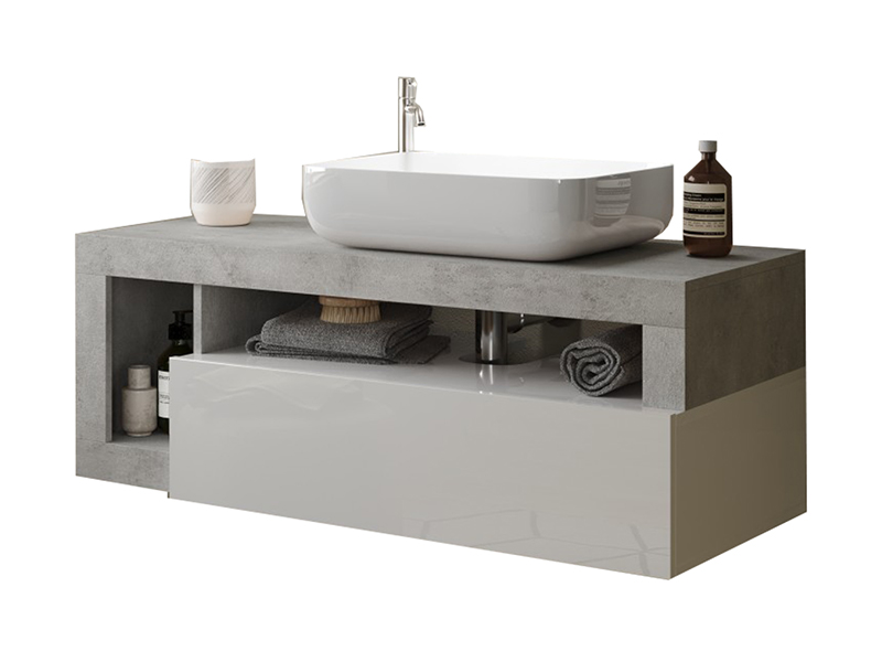 Panneaux de particules 16mm revetus de décor imitation béton et blanc brillant. Robinet et siphon non inclus. Bonde non fournie. Diamètre de l'évacuation : 42 mm. Pas de trop plein sur la vasque. Diamètre du perçage pour robinet : 35 mm.