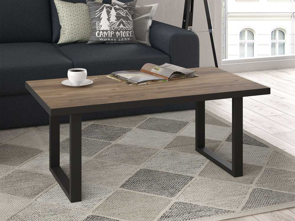 Panneaux de particules revetus de décor chene riviera/noir. Piètement en plastique pour buffets, meubles tv et vitrines de cette gamme. Piètement en métal pour table basse et table de repas.