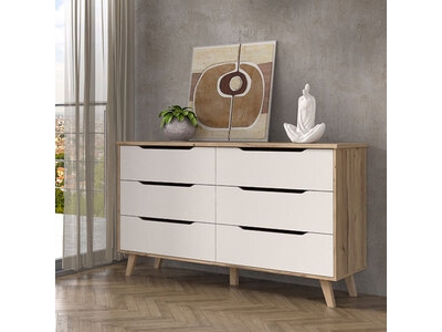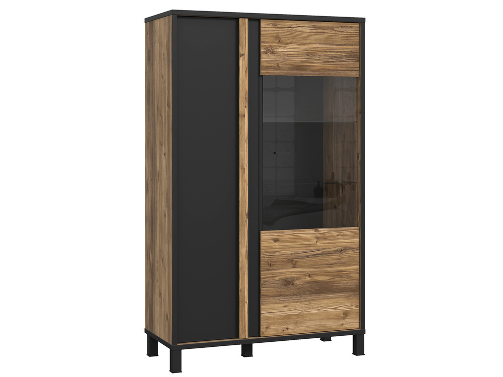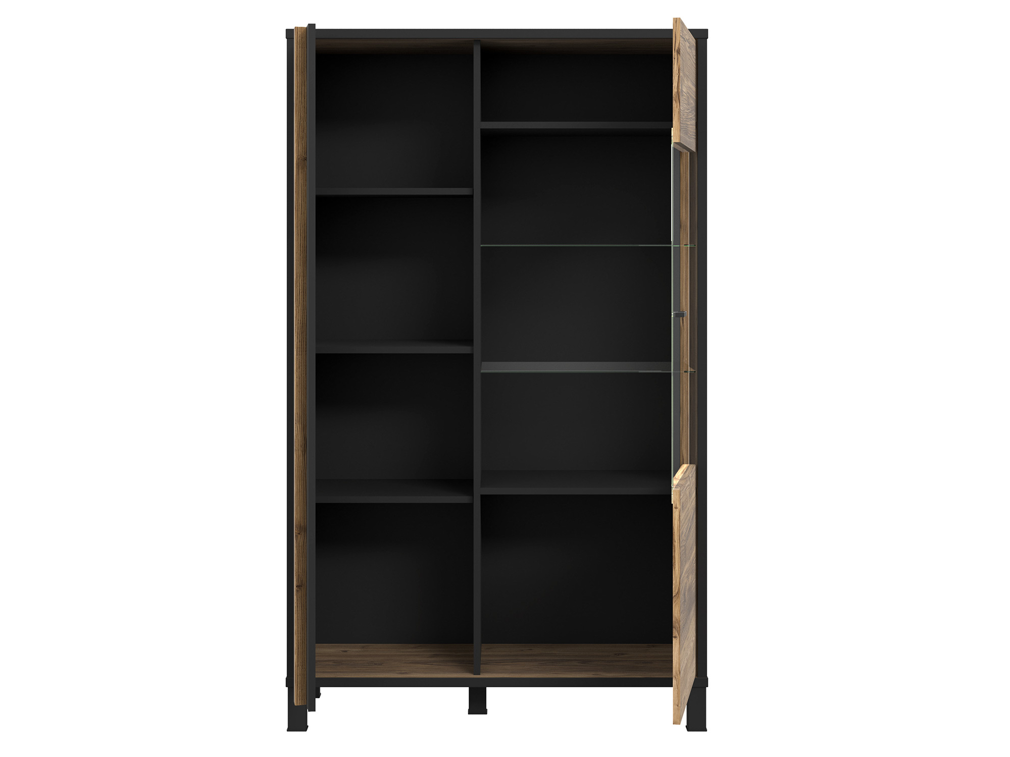 Panneaux de particules revetus de décor chene riviera/noir. Piètement en plastique pour buffets, meubles tv et vitrines de cette gamme. Piètement en métal pour table basse et table de repas.