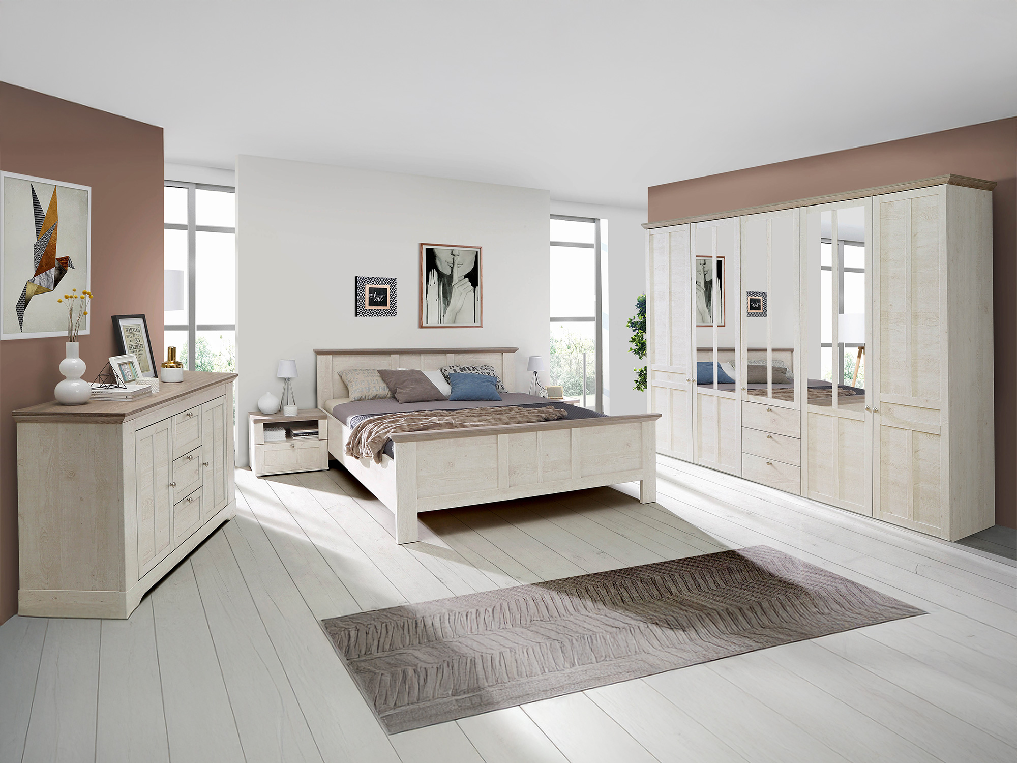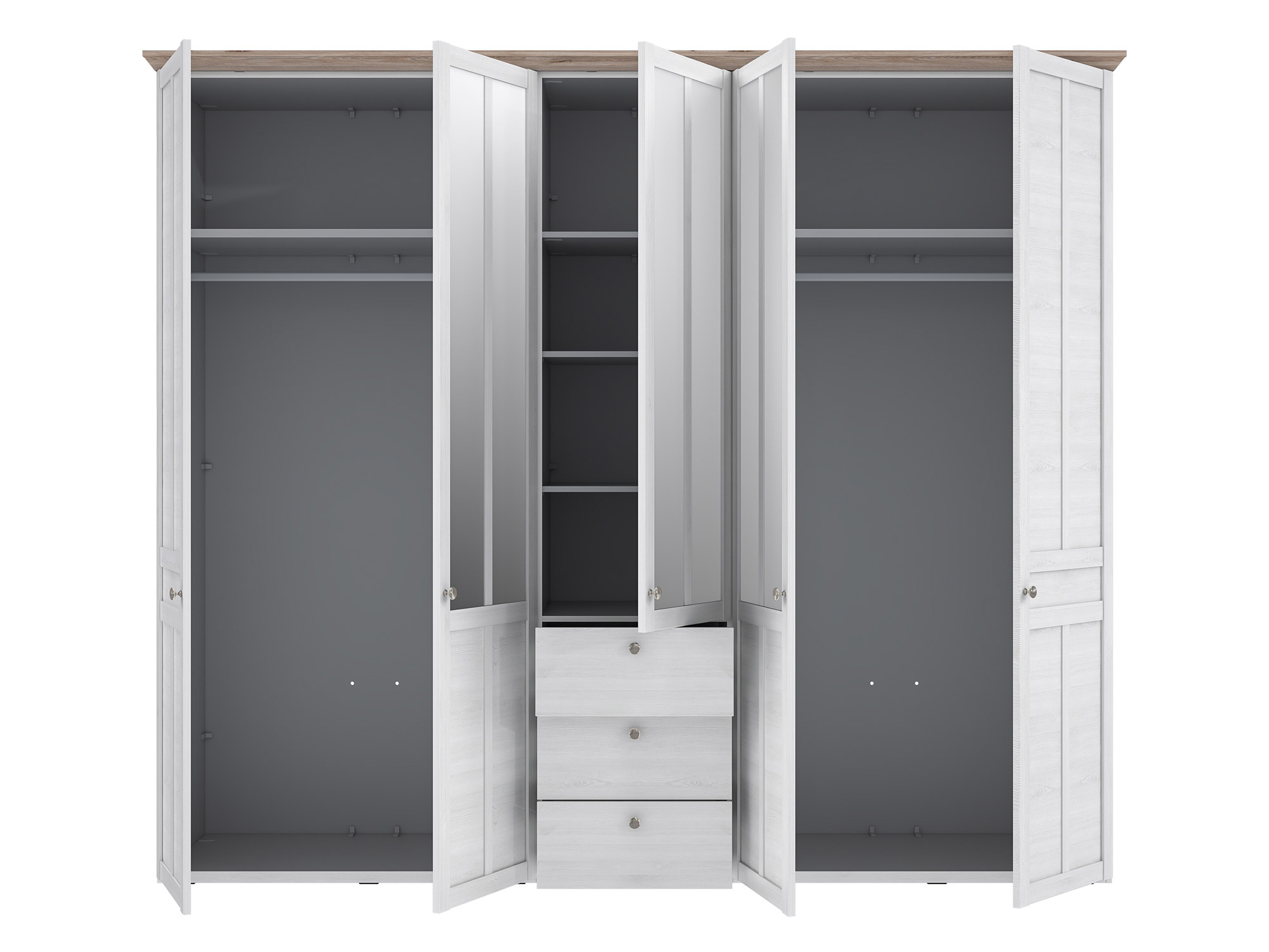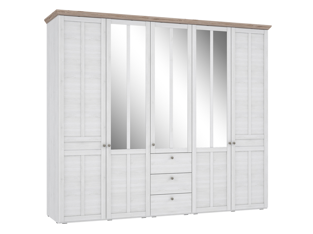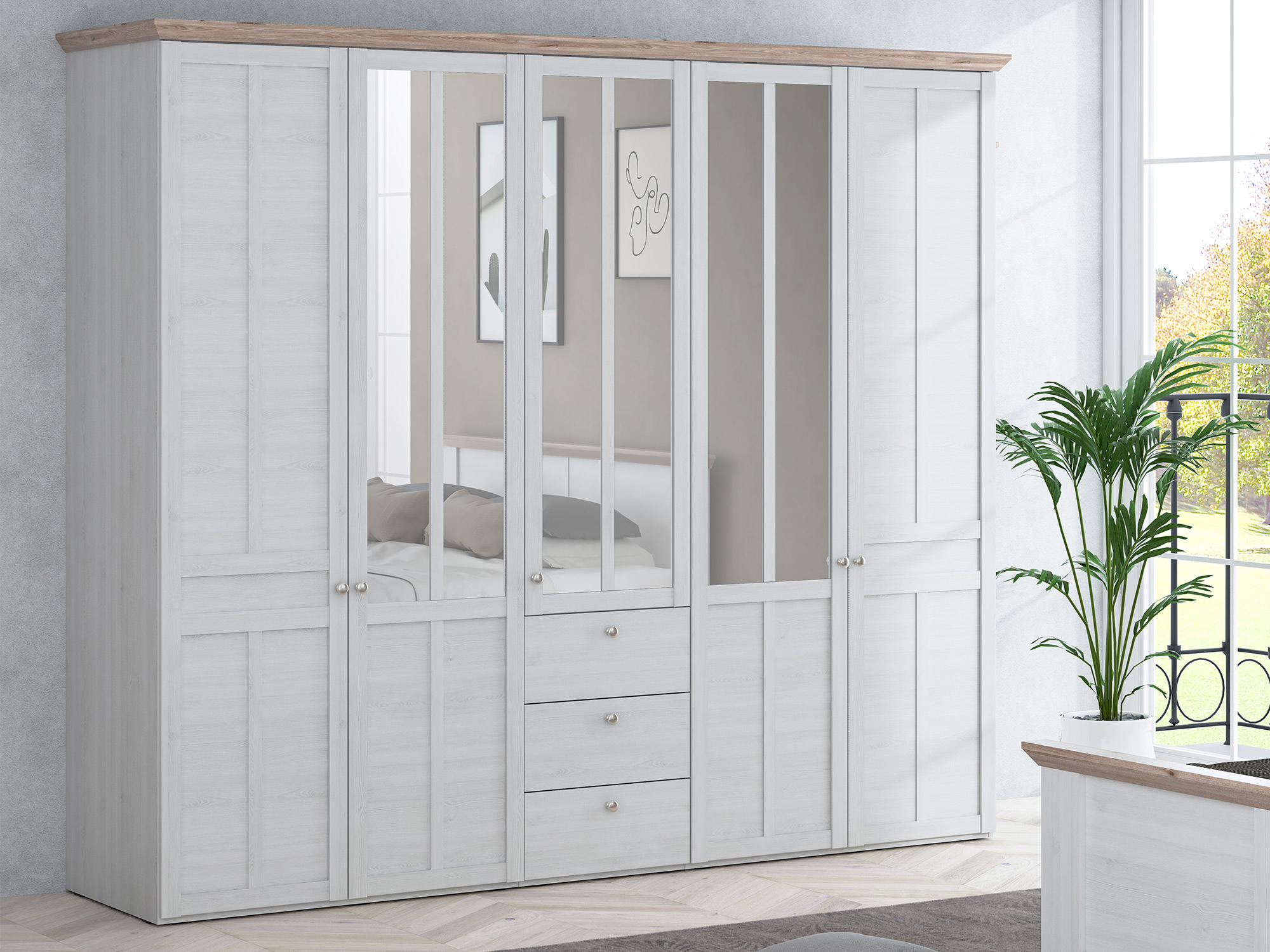 Armoire 5 portes battantes dont 3 avec miroir et 3 tiroirs.