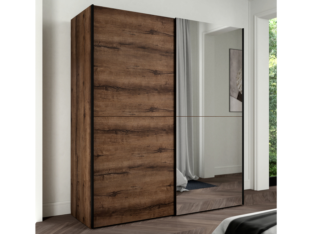 Armoire 2 portes coulissantes dont 1 miroir. décor imitation noyer.