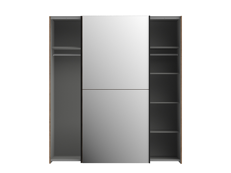 Poignées et quincaillerie en métal. Intérieur de l'armoire coloris gris.