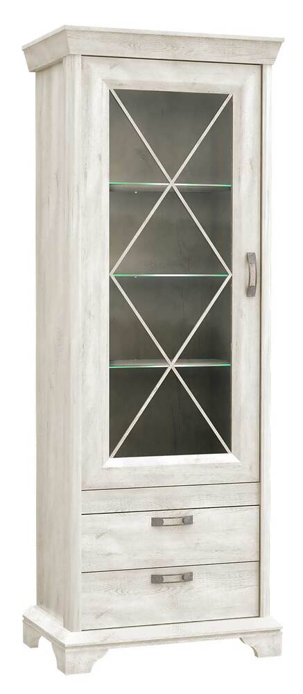 L’atout de la vitrine 1 porte avec éclairage Kashmir n’est pas son style uniquement, mais aussi sa solidité. Elle est fabriquée à partir de panneaux de particules (épaisseur des différents plateaux: 22, 28, 35, 44,56 mm) et MDF recouvert de bandes papier décor 3mm HDF, les bords étant en ABS 2mm. Les fonds des tiroirs sont en HDF laqués, ayant une épaisseur de 2mm, tandis que les corps des tiroirs sont en panneaux de particules recouverts de film PP. Le style élégant est complété par les poignées en métal, décor argent vieilli. Les tiroirs sont par ailleurs placés sur des glissières métalliques avec roulement à billes. Les pieds et les montants sont en MDF.