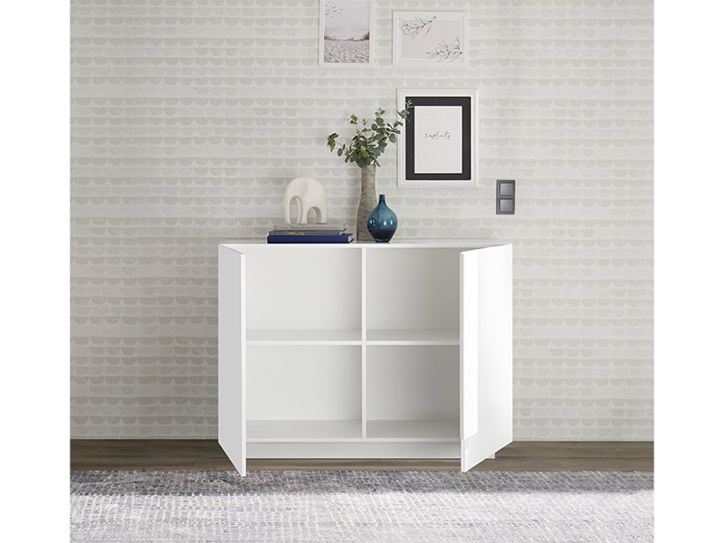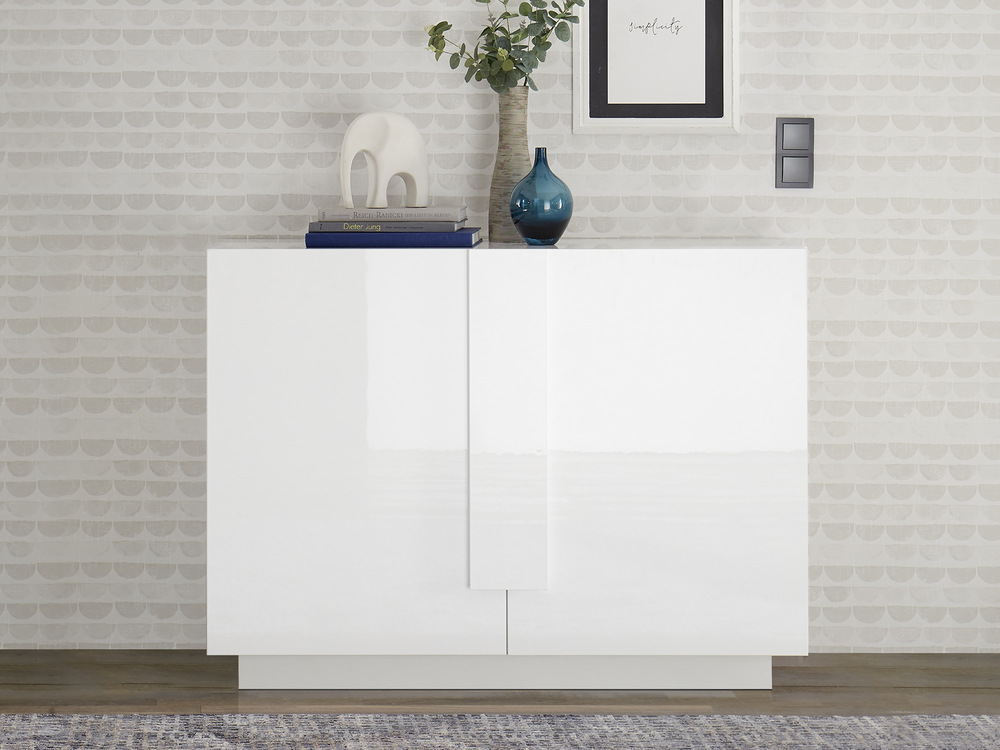 Structure et façades en agglomere de bois, épaisseur 16mm, finition blanc laqué brilliant.Poignées en agglomere de bois, épaisseur 22mm, finition blanc laqué brilliant.