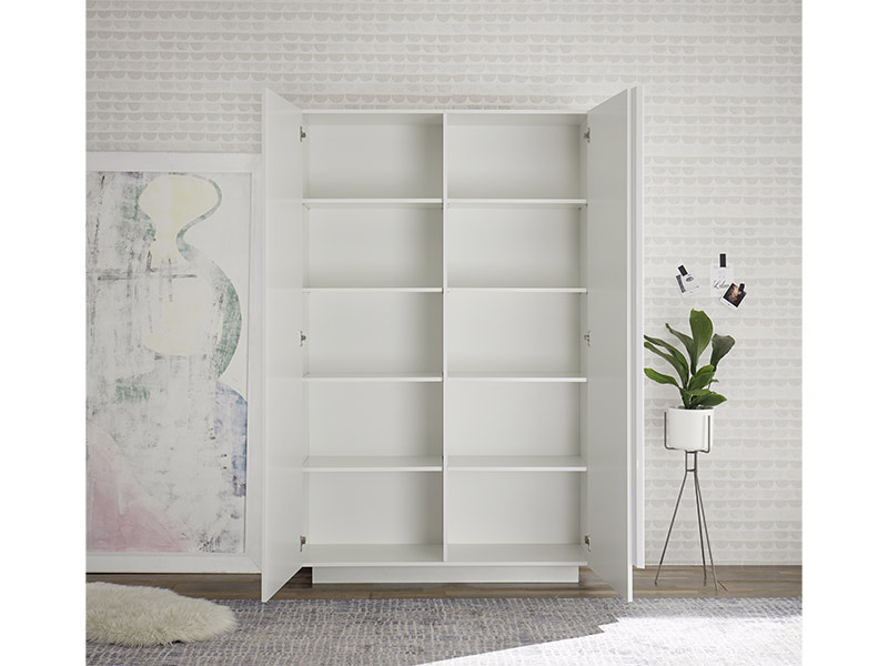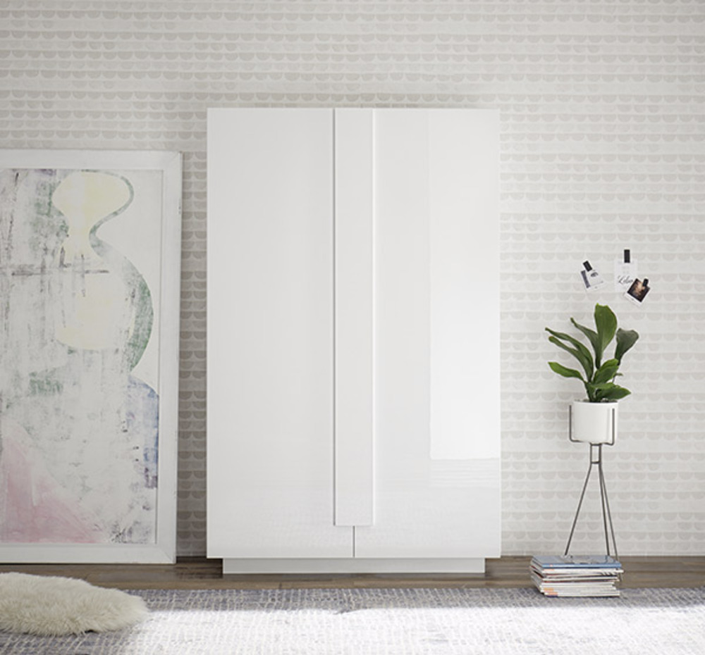 Structure et façades en agglomere de bois, épaisseur 16mm, finition blanc laqué brilliant.Poignées en agglomere de bois, épaisseur 22mm, finition blanc laqué brilliant.