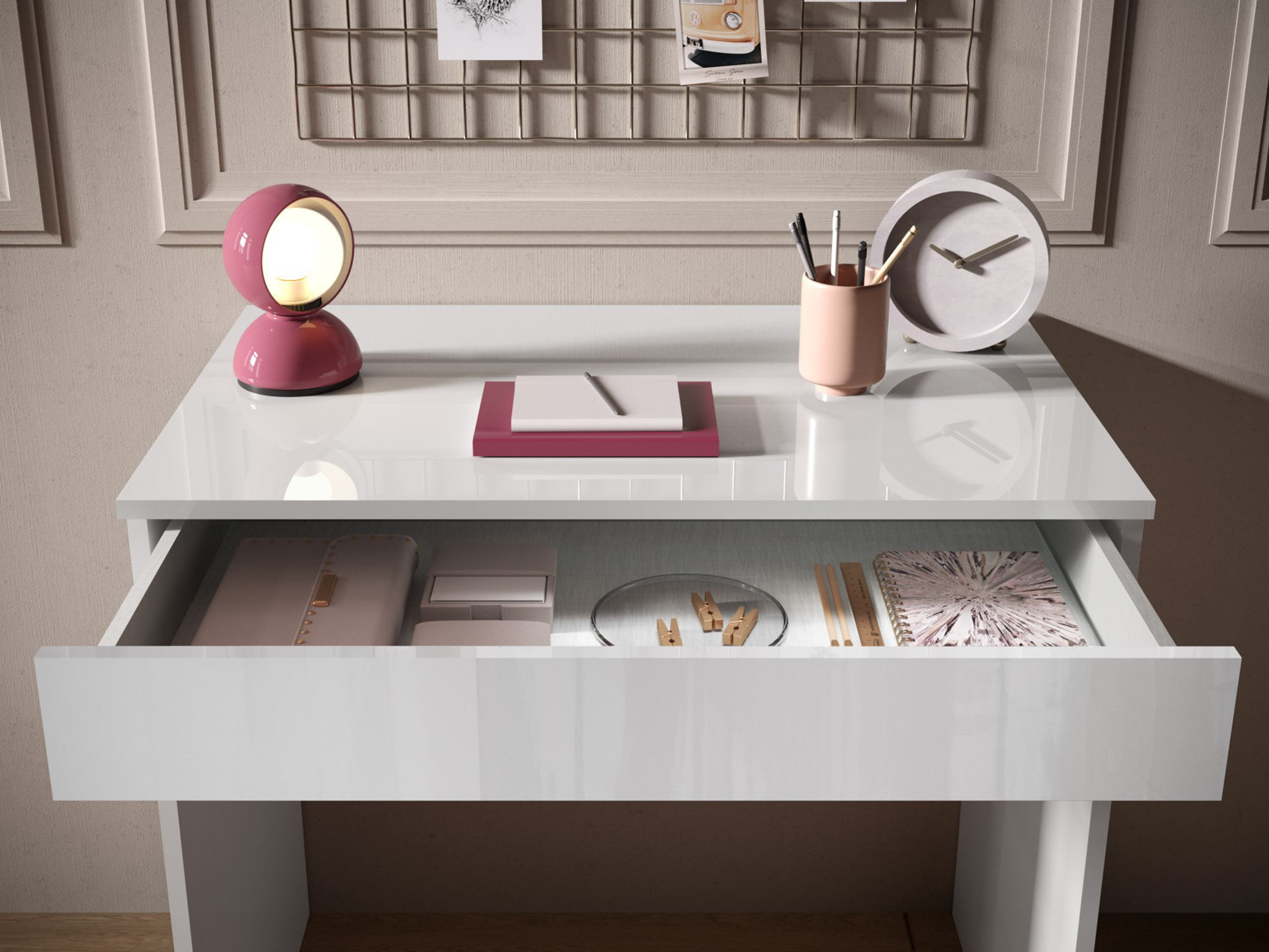 Le bureau Smile est composé de panneaux de particules de 16 mm d'épaisseur, avec une finition blanc laqué, qui ajoute une touche sophistiquée à n'importe quelle pièce. Le meuble mesure 110 cm de long, 76 cm de haut et 50 cm de profondeur, offrant un espace de travail compact mais pratique. Il dispose d'un tiroir avec quincaillerie et poignée en métal pour un accès facile et un look raffiné. Facile à assembler, ce bureau laqué blanc Smile est garanti 2 ans et se nettoie simplement avec un chiffon sec.