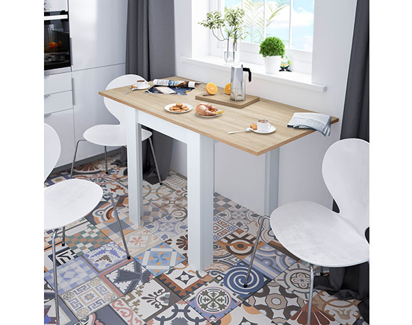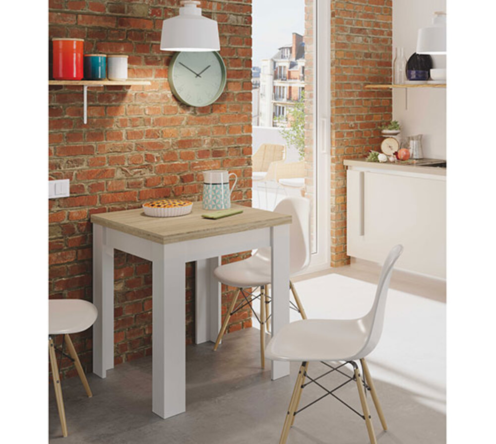 Cette petite table extensible Libro peut passer de 67 cm à 134 cm en un clin d'œil. Sa structure est réalisée en panneaux de particules mélaminés de 18 mm et 15 mm d'épaisseur, et comprend des chants en PVC de 0,6 mm. Ses charnières ainsi que ses glissières sont en métal. De plus, les butoirs ABS antibruits et anti rayures sont fabriqués en thermoplastique de haute endurance. La table de cuisine Libro propose un décor blanc et chêne résolument moderne !