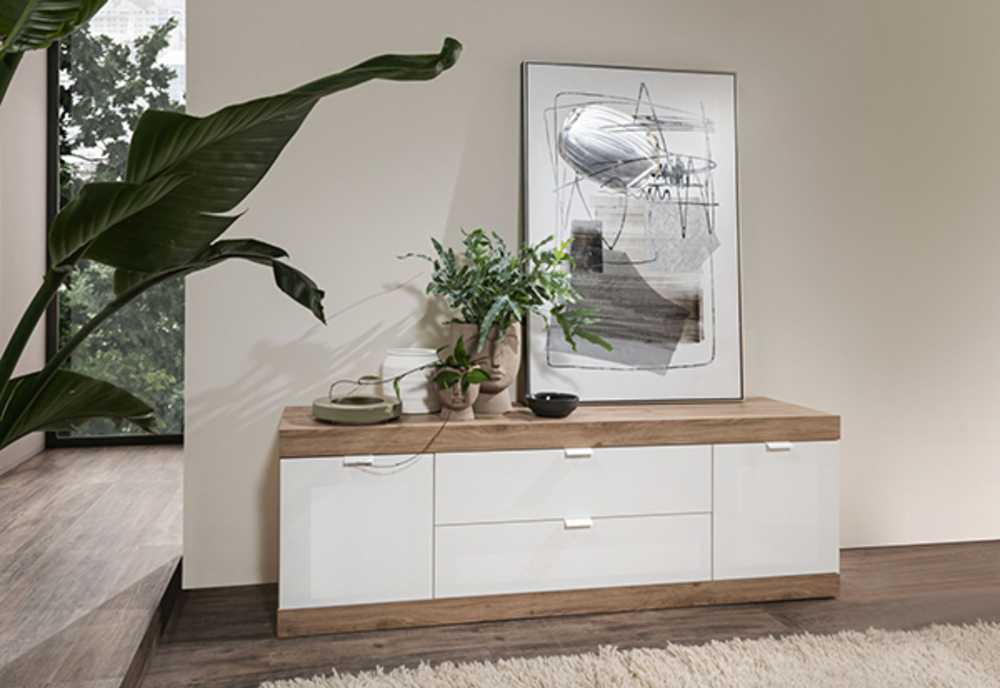 Meuble tv 2 portes 2 tiroirs Lime chene cadiz/blanc brillant