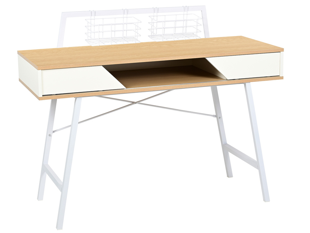 Le plateau est fabriqué en panneaux de particules de 15 mm avec un revêtement en mélamine couleur bois, offrant une surface de travail durable et élégante. Les deux portes coulissantes et la niche centrale permettent un rangement pratique pour vos documents et fournitures, tout en gardant votre espace de travail organisé et net. Le piètement en métal blanc, robuste et stable, complète harmonieusement le design nordique de ce bureau pas cher Marco. Fabriqué en Asie et facile à assembler, il bénéficie d'une garantie de 2 ans.
