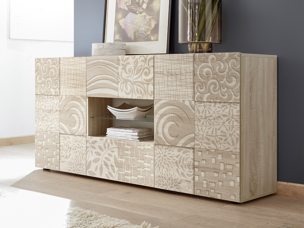 Le bahut 2 portes 2 tiroirs Miranda chêne samoa accueillera sans difficulté vos affaires grâce à ses rangements multiples. Vos petits objets décoratifs trouveront eux aussi leur place sur l’étagère en verre, au centre. Vous apprécierez sans doute ses façades en sérigraphie décor bois ainsi que la qualité de sa structure en panneaux de particules de 16mm d’épaisseur.