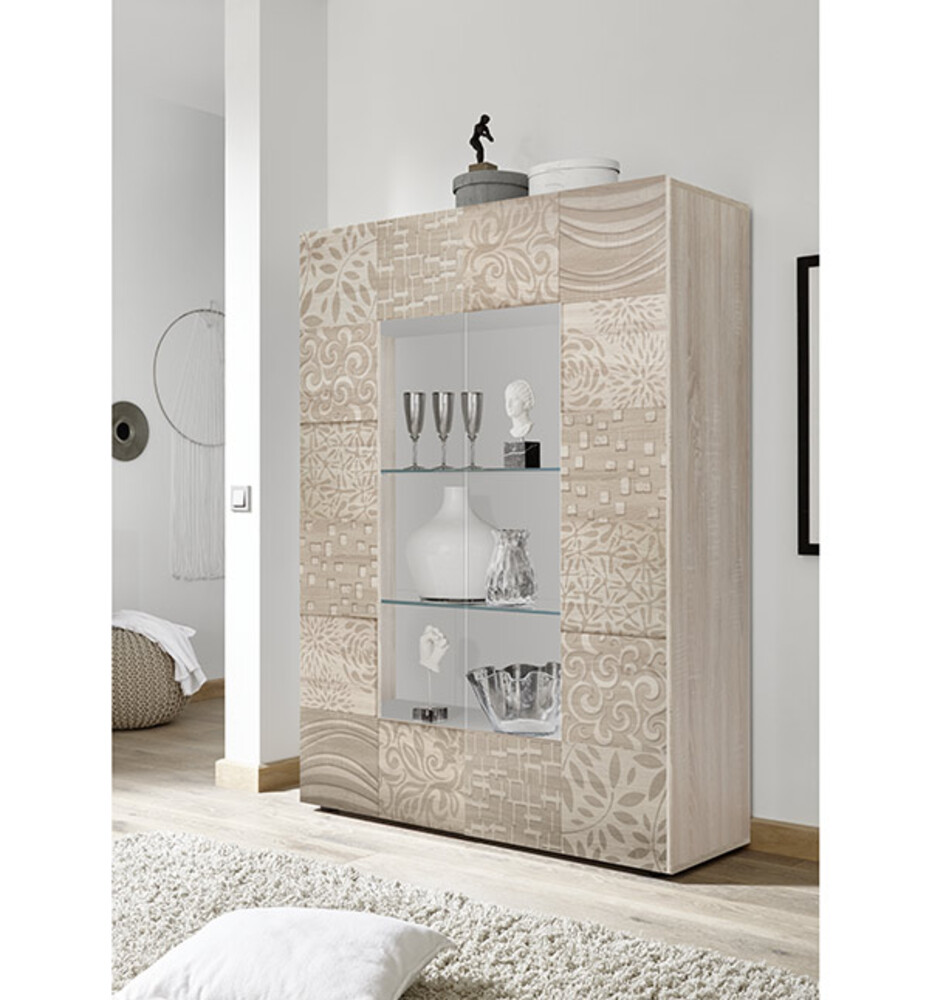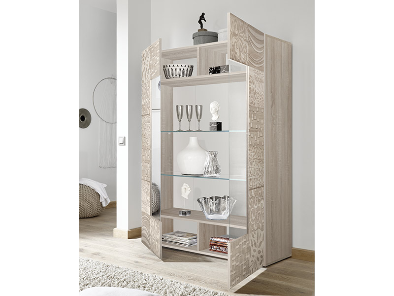 Equipée de 2 portes vitrées, la vitrine Miranda chêne samoa vous permettra d’optimiser votre rangement. Ce meuble est réalisé en panneaux de particules de 16mm. Sa structure est sublimée par un revêtement en papier décor chêne samoa, et une façade en sérigraphie.