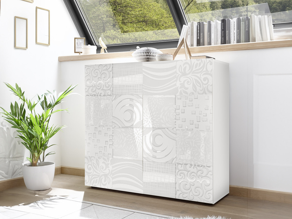 Le meuble de rangement 2 portes Miranda vous séduira également par ses façades en sérigraphie décor blanc laqué. Livré en 2 colis de 60kg, ce meuble se montera facilement à l’aide de la notice et devra être fixé au mur.