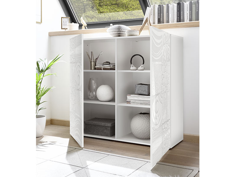 Le meuble de rangement Miranda blanc laqué est fabriqué en Italie. Il est réalisé en panneaux de particules de 16mm. Derrière chaque porte se trouvent 2 étagères pour un rangement efficace. Enfin, les portes disposent de charnières en métal.