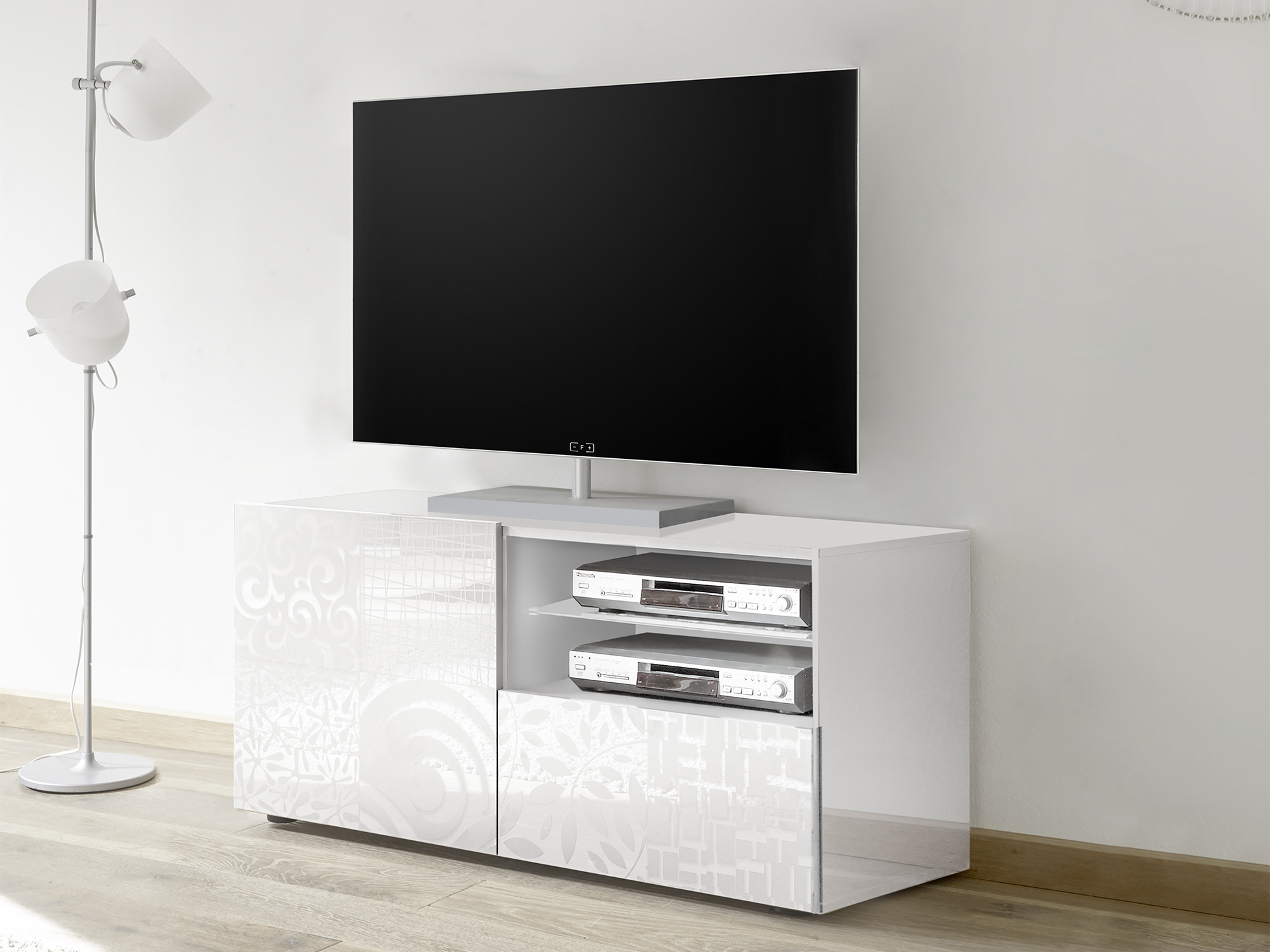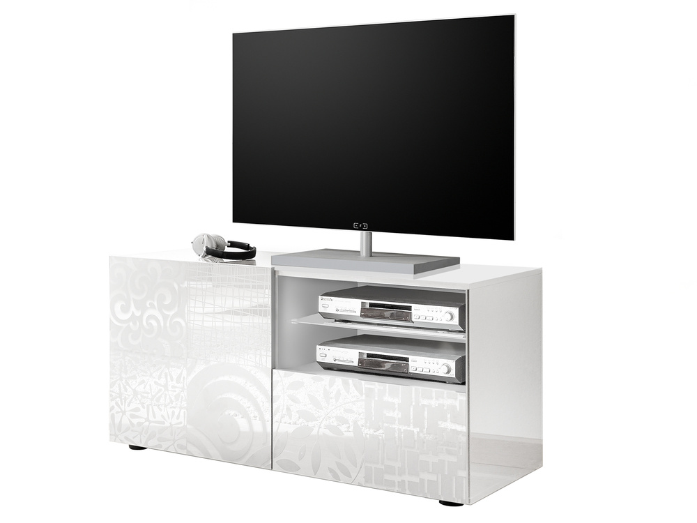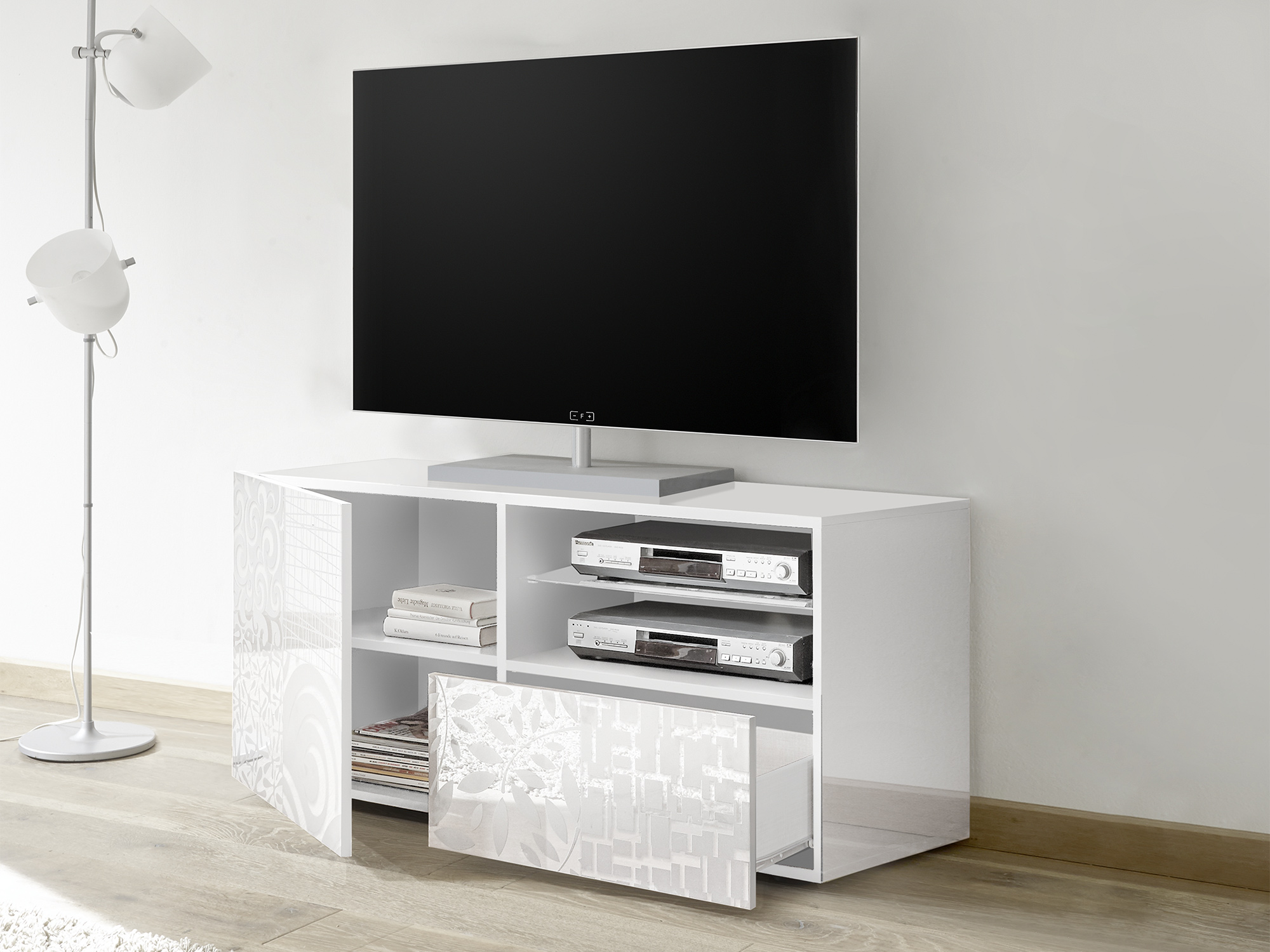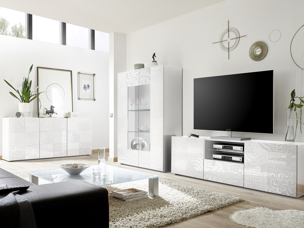 Fonctionnel, le meuble tv Miranda blanc laqué vous permettra évidemment de ranger votre matériel hifi. La structure est réalisée en panneaux de particules d’une épaisseur de 16mm. La note d’originalité du meuble est assurée par les motifs sur les façades.