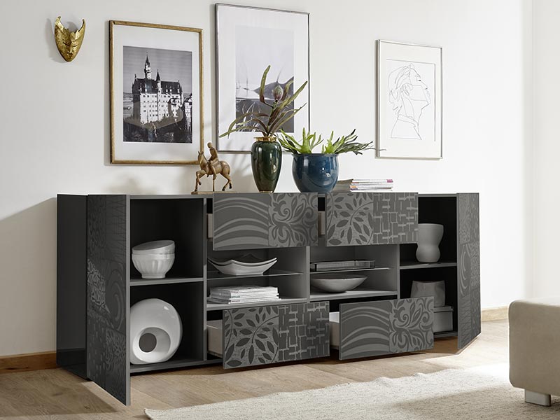 Bahut 2 portes 4 tiroirs Miranda laqué grise sérigraphié