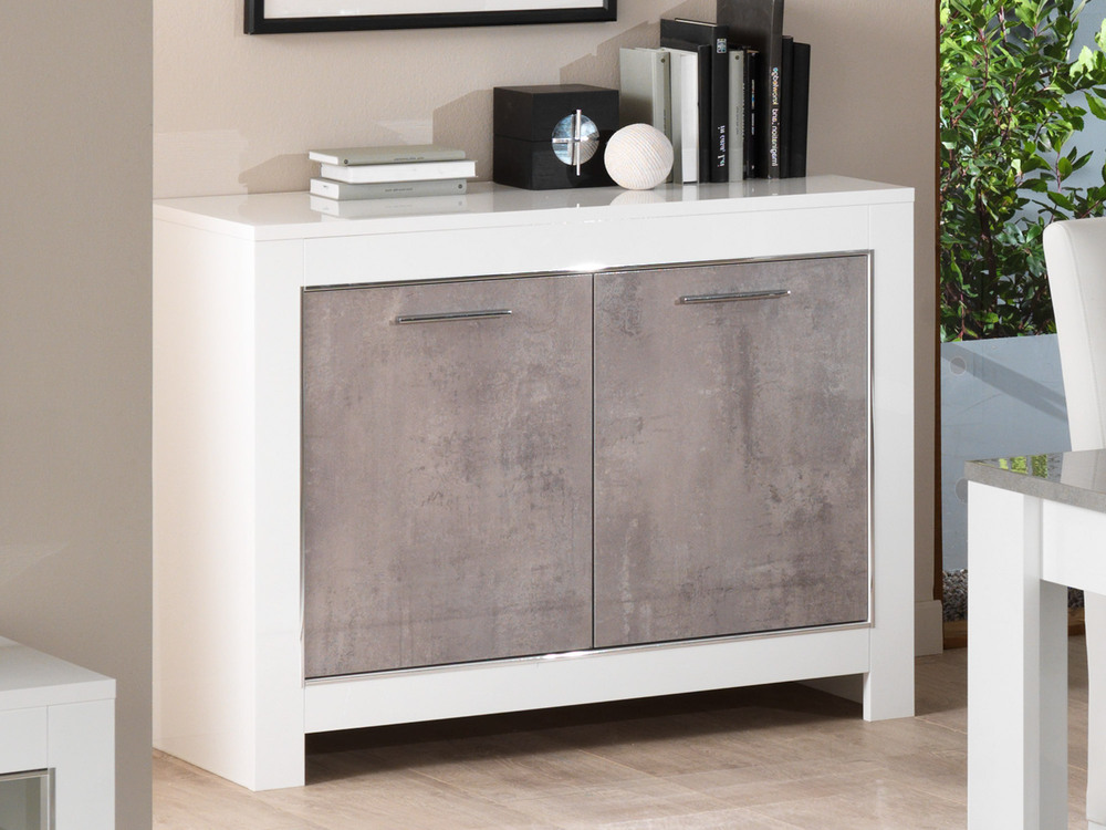 Le bahut 2 portes Modena blanc/béton est garanti 2 ans. Cette gamme propose également des buffets 3 et 4 portes.