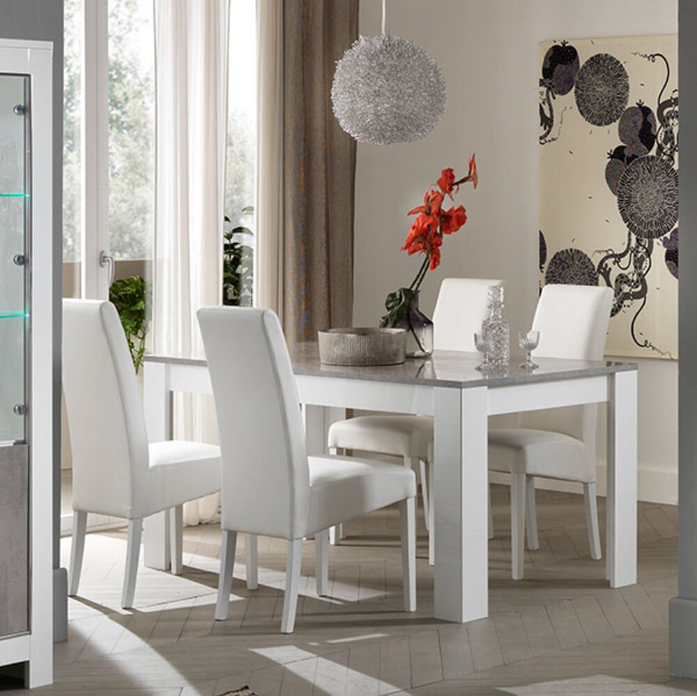 Cette table de repas Modena a été conçue pour accueillir entre 4 et 6 personnes. Moderne avec sa finition laquée blanc/béton, elle donnera plus d’éclat et de charme à votre décoration. La structure de ce meubles est en panneaux de particules E1 22mm. Pour assurer la résistance de la surface laquée, un vernissage à rayons UV a été réalisé, à partir de matériaux atoxiques et anallergiques.