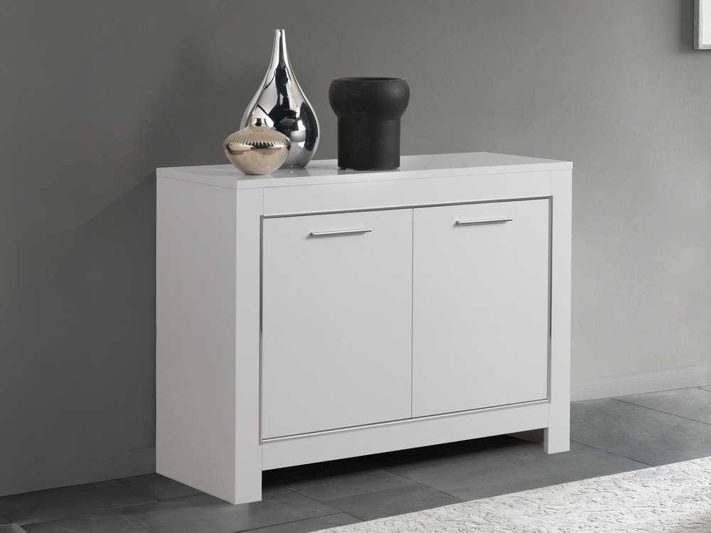 Enfilade 2 portes. Aménagement intérieur: 2 étagères en bois.Poignées et décoration en plastique chromée.