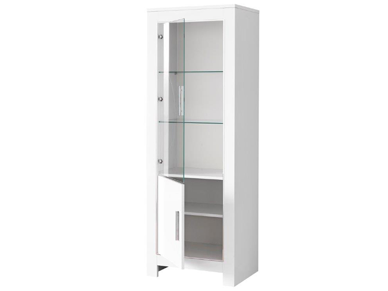La vitrine Modena est composée d’une porte vitrée (101x47,3cm) derrière laquelle vous trouverez 2 étagères (59,9x38cm) et d’une porte pleine qui cache 1 étagère en bois. La porte vitrée et les étagères ont une épaisseur de 5mm. Cette colonne trouvera facilement sa place dans n’importe quelle salle à manger grâce à ses dimensions réduites : une largeur de 64cm, une hauteur de 180cm et une profondeur de 45cm. Son coloris blanc se mariera à merveille avec le reste de vos meubles. La porte, les côtés et le dessus sont laqués brillants. Les matériaux utilisés pour le vernissage sont atoxiques et anallergiques. Le vernissage à rayons U.V garantit à la surface laquée une forte résistance. Les poignées et la décoration appliquée sur la façade de la vitrine sont en plastique chromé. De plus, un spot halogène est installé dans la partie haute. L'éclairage led est intégré.