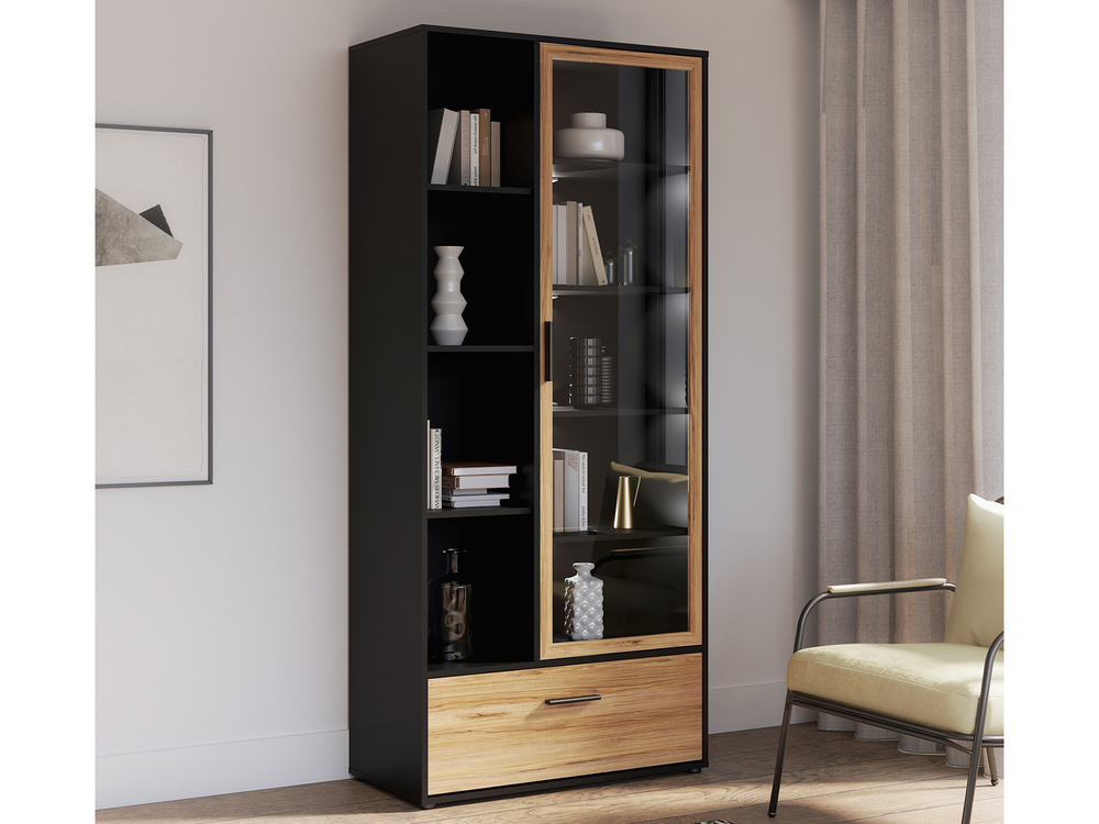 Vitrine 1 porte en verre,1 tiroir et 4 niches.