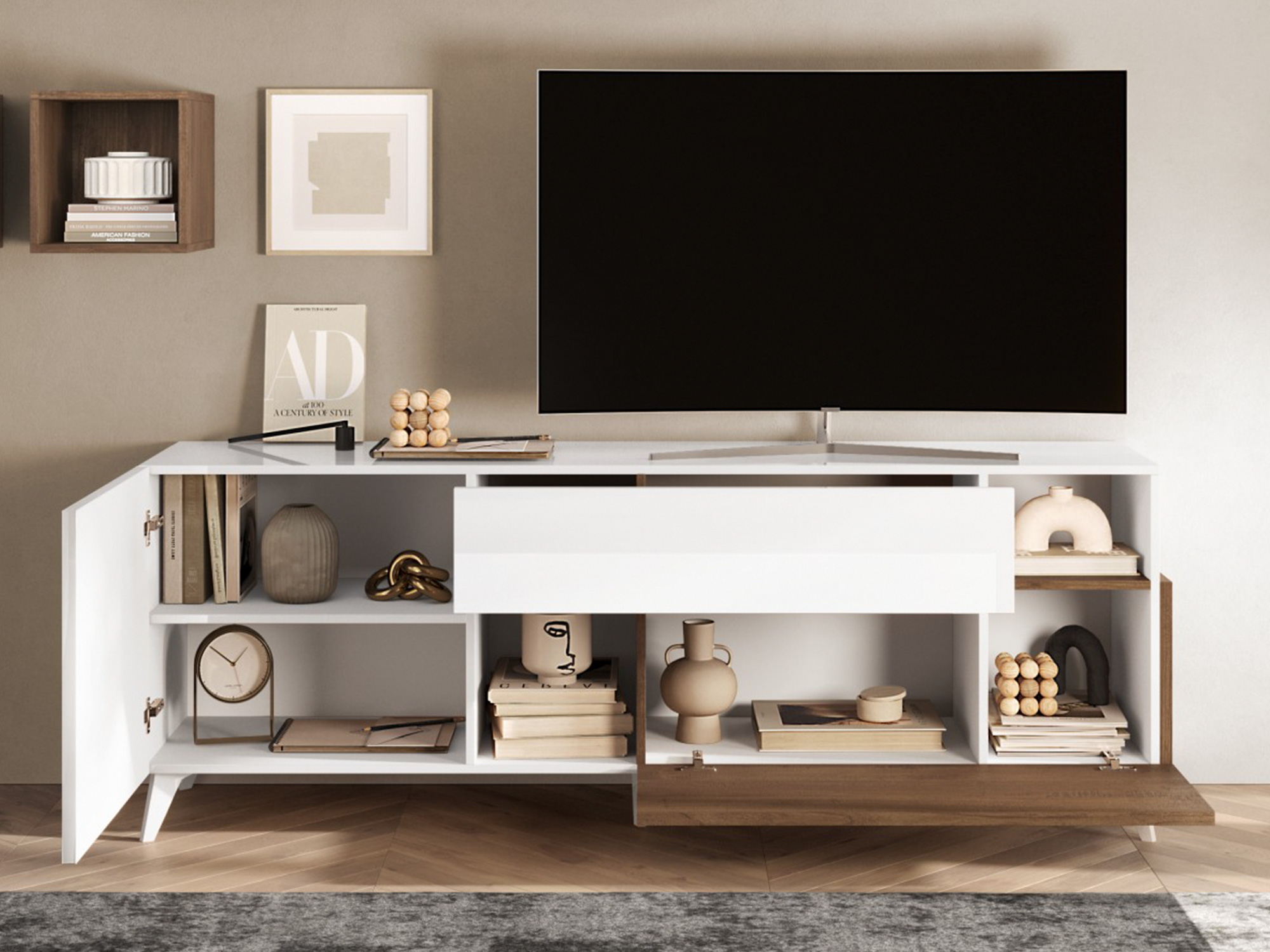 Meuble TV 1 porte, 1 abattant et 1 tiroir.